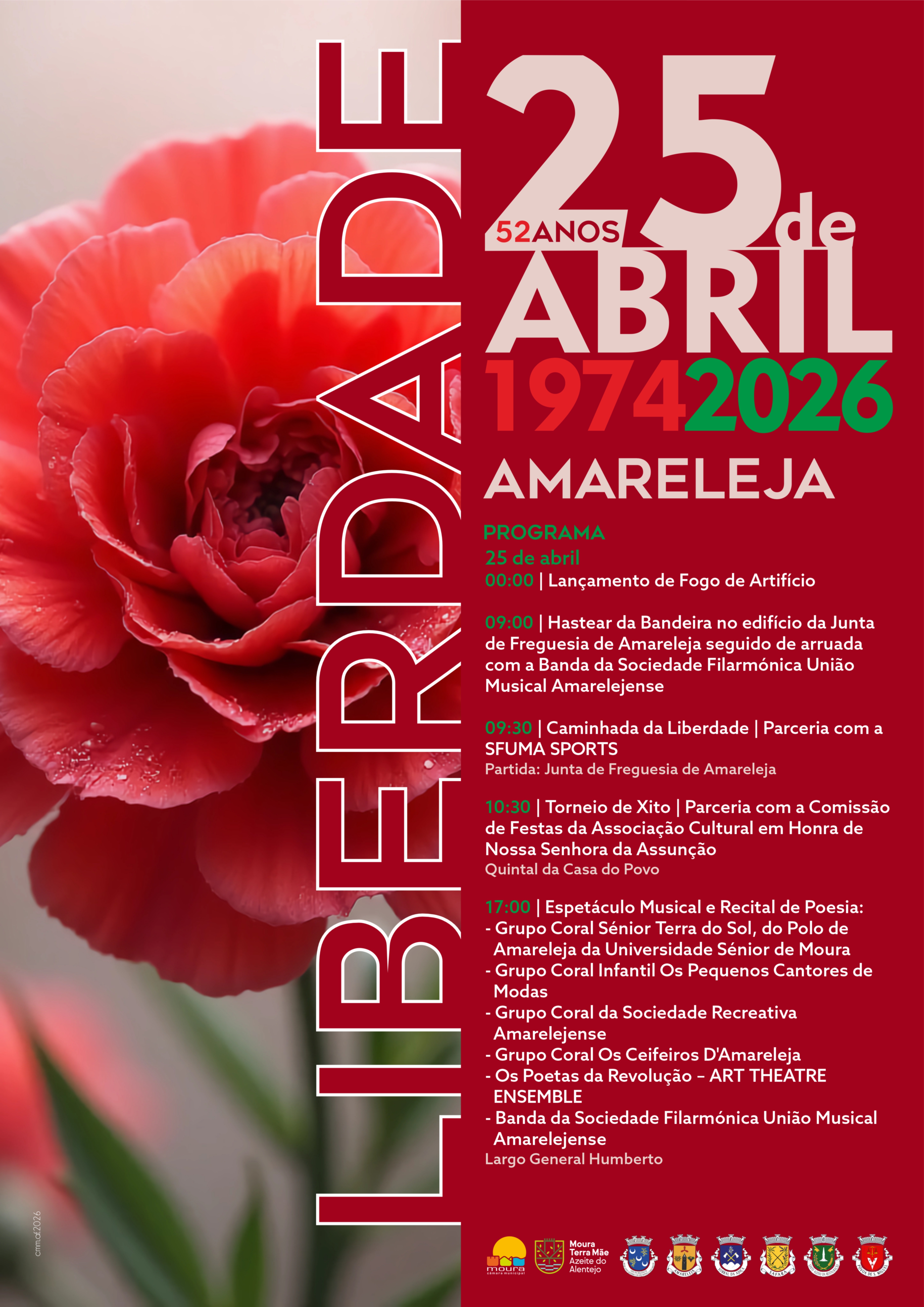 A Câmara Municipal de Moura apela à participação da população nas comemorações, convidando todos a celebrar os 52 anos do 25 de Abril, símbolo maior da liberdade em Portugal.