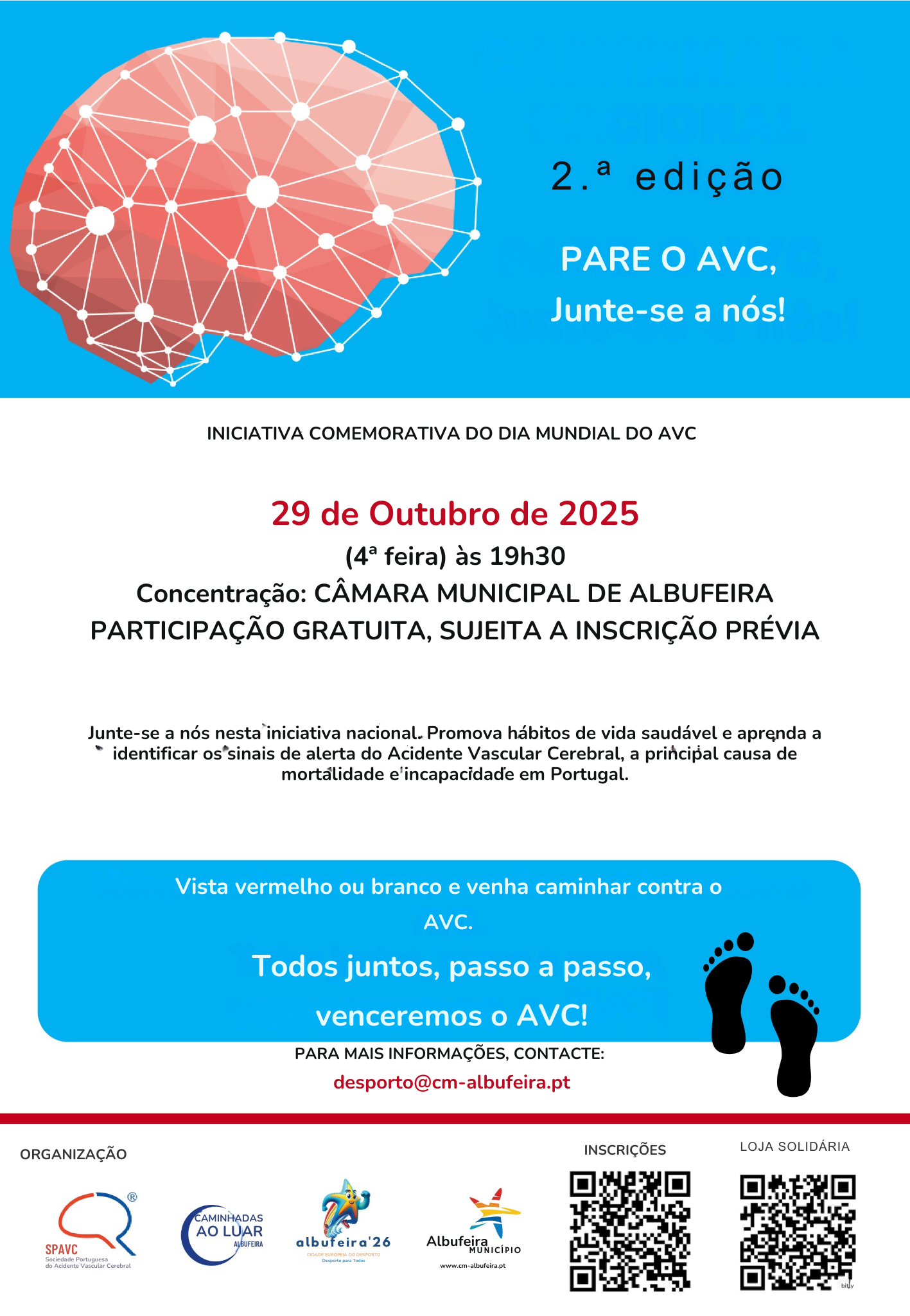 A iniciativa organizada pela Sociedade Portuguesa do Acidente Vascular Cerebral (SPAVC) em parceria com o Município de Albufeira pretende, no Dia Mundial do AVC, consciencializar a população para hábitos de vida saudáveis e alertar para os fatores de risco e medidas preventivas da patologia. A caminhada inclui dois percursos e a concentração está marcada para as 19h30, na Câmara Municipal de Albufeira. A inscrição é gratuita, mas obrigatória, e já pode ser feita aqui ou através do QR Code disponível no cartaz. Vista uma peça de roupa vermelha ou branca e junte-se a nós nesta caminhada contra o AVC!