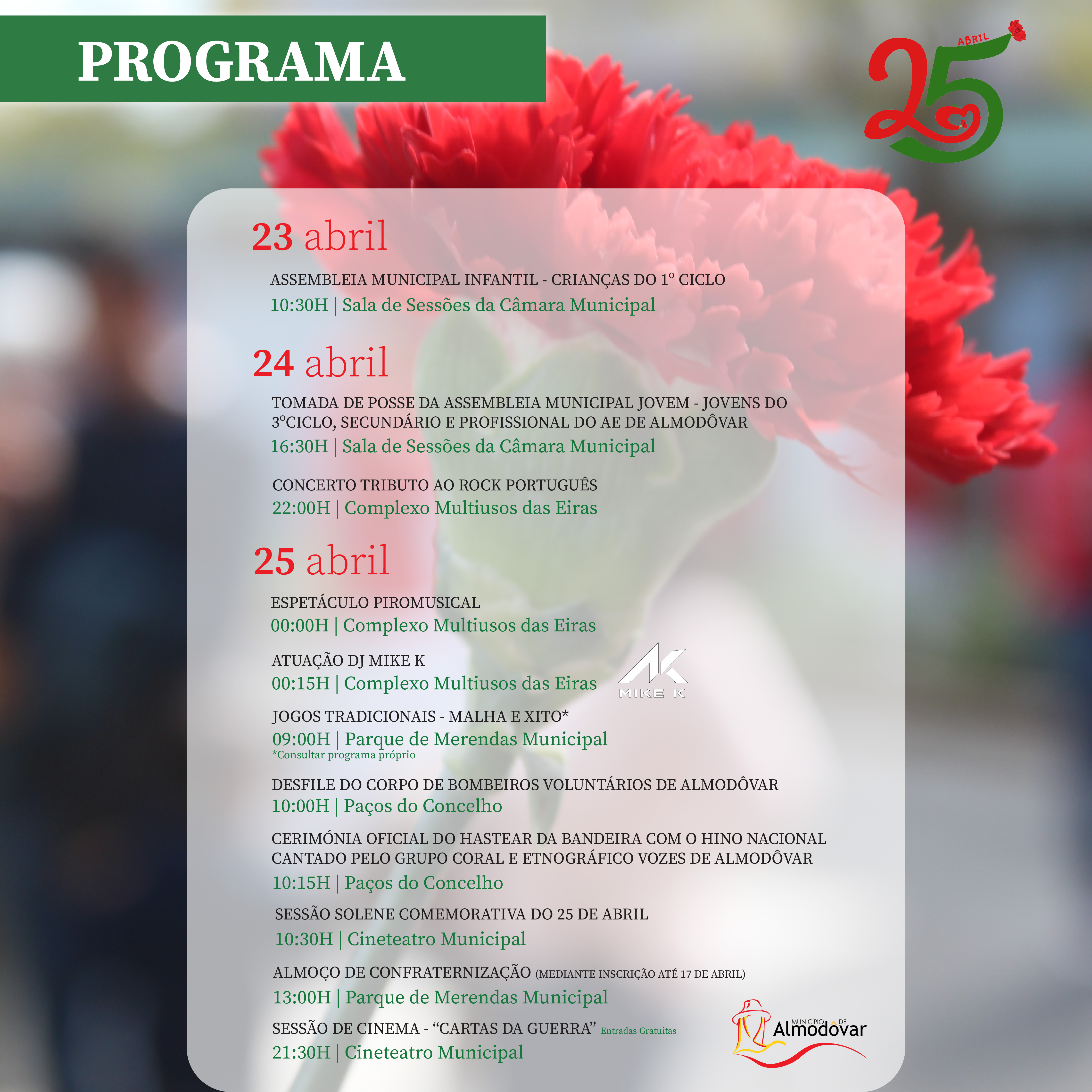 No dia 24 de abril, realiza-se a Tomada de Posse da Assembleia Municipal Jovem, com a participação de jovens do 3.º ciclo, ensino secundário e ensino profissional do Agrupamento de Escolas de Almodôvar, agendada para as 16h30, na Sala de Sessões da Câmara Municipal. Ainda nesse dia, pelas 22h00, o Complexo Multiusos das Eiras recebe o Concerto Tributo ao Rock Português.