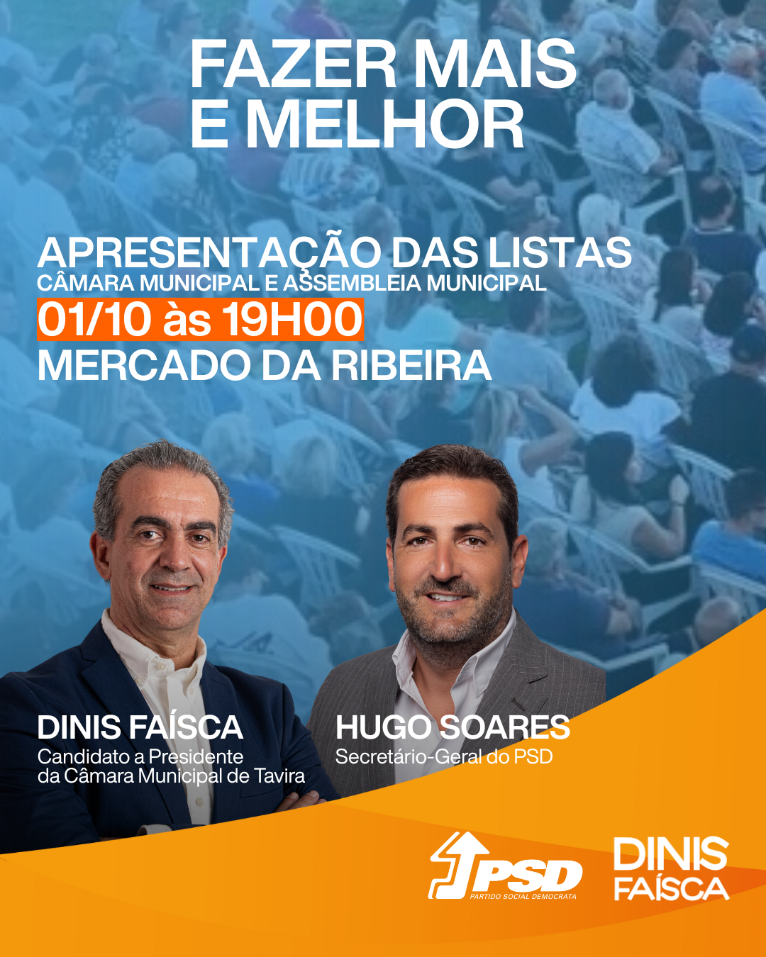 Presença do Secretário-Geral do PSD no evento de apresentação dos candidatos do PSD em Tavira pelas 19h00 no Mercado da Ribeira, bem no coração da baixa da cidade de Tavira.