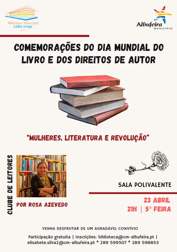 No âmbito das comemorações do Dia Mundial do Livro e do Direito de Autor, a Biblioteca Municipal Lídia Jorge, em Albufeira, promove nesta quinta-feira, dia 23 de abril, às 21h00, um encontro especial do Clube de Leitores da BMLJA. Sob o tema "Mulheres, Literatura e Revolução", a sessão será dinamizada por Rosa Azevedo.