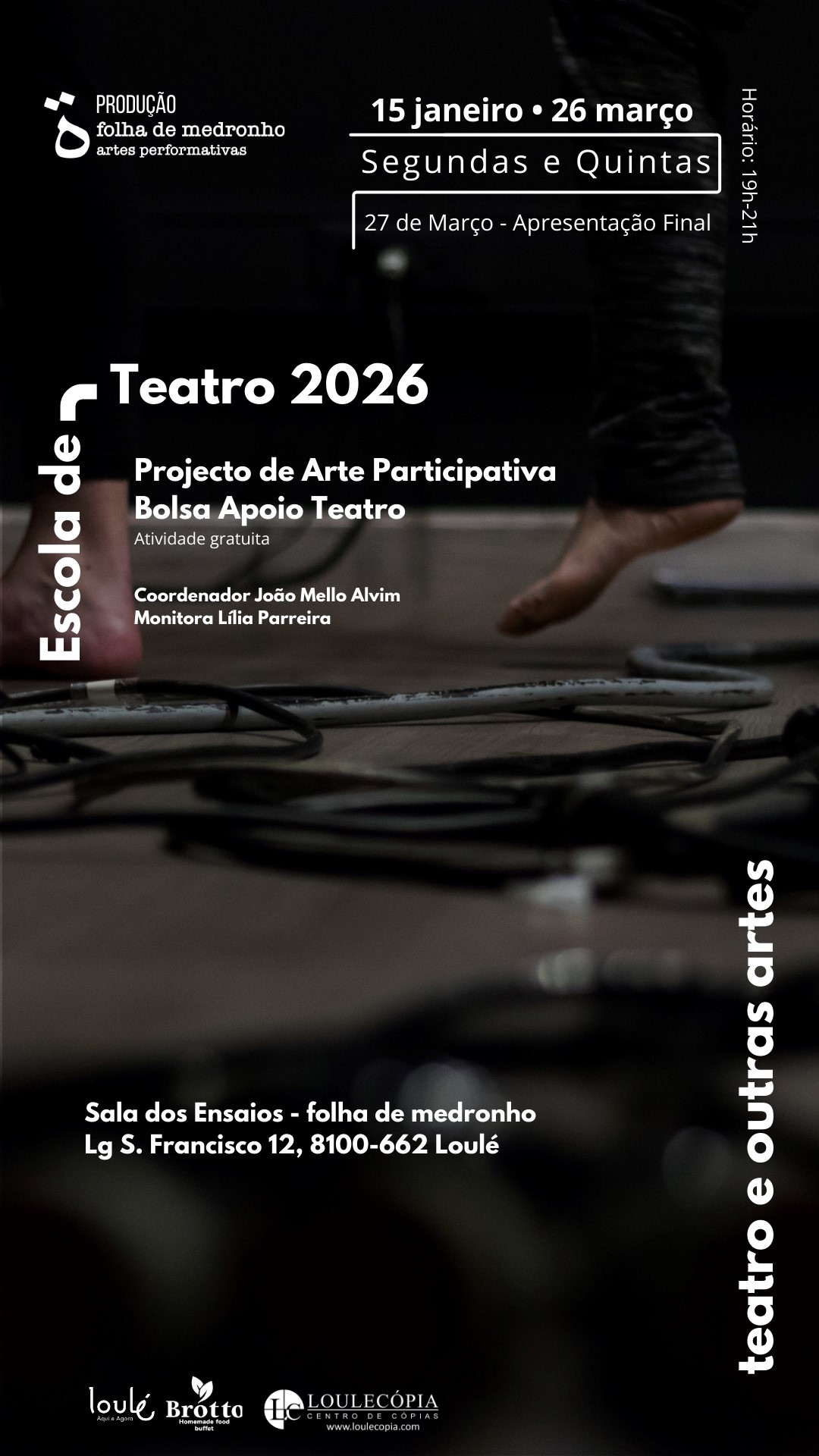 A ESCOLA de TEATRO’26 ocorrerá de janeiro a março de 2026, em horário pós-laboral, duas vezes por semana, na black box da “folha de medronho”, a Sala dos Ensaios, sita no Largo São Francisco nº 12, em Loulé.