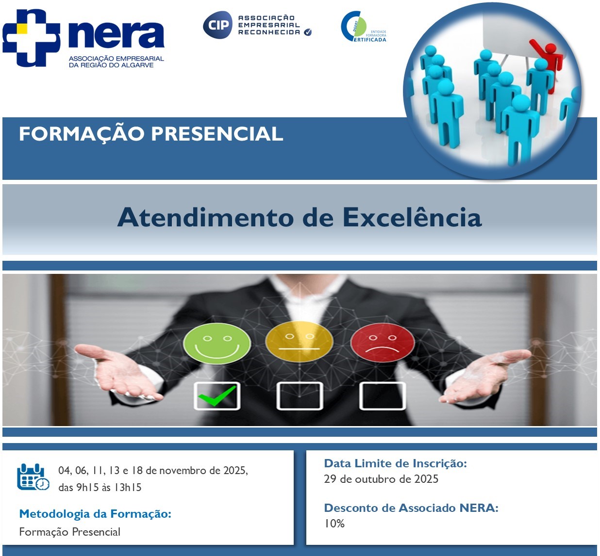 Com o objetivo de reconhecer a importância da função atendimento e dos profissionais que a exercem, para a melhoria da qualidade dos serviços e da imagem das organizações, desenvolver competências técnico-comportamentais que permitam ao profissional ultrapassar barreiras, prevenir e dar resposta a situações de objeção ou de reclamação e fomentar o espírito de autoanálise contínuo das práticas profissionais com vista ao aperfeiçoamento progressivo, o NERA irá realizar, nas suas instalações, nos dias 04, 06, 11, 13 e 18 de novembro de 2025, das 9h15 às 13h15, a ação de formação: Atendimento de Excelência.