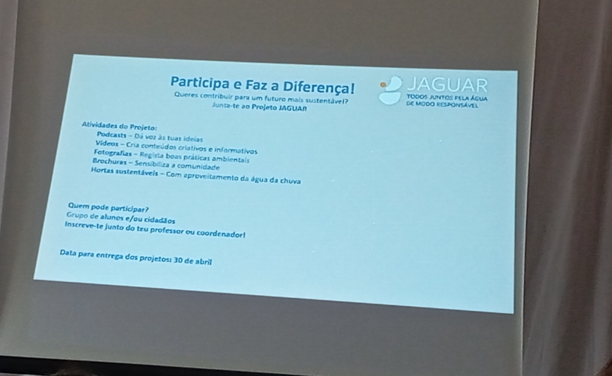 Ao longo da manhã, foi apresentado o projeto JAGUAR, bem como o conjunto de atividades previstas, seguindo-se uma abordagem dedicada ao uso sustentável da água e à partilha de boas práticas. Um dos pontos altos foi a explicação sobre o Cálculo da Pegada Hídrica (https://ech2o.aprh.pt/peghidrica/pt/), que permitiu aos participantes refletir sobre o impacto das suas escolhas diárias no consumo dos recursos hídricos. A iniciativa terminou com a distribuição de kits de sensibilização, incentivando a adoção de comportamentos mais responsáveis no dia a dia.