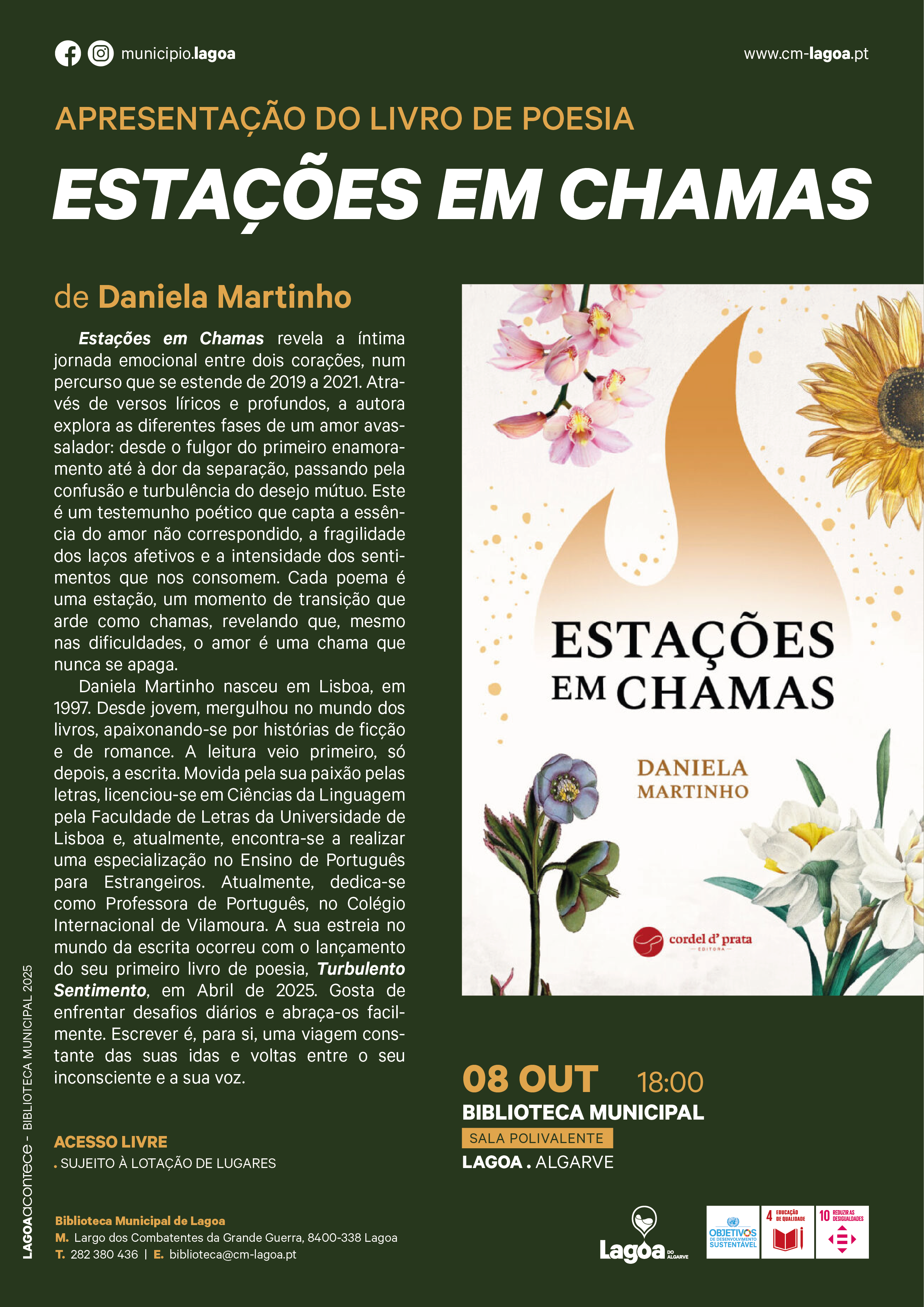 A cidade de Lagoa, no Algarve, será palco da apresentação do mais recente livro de poesia de Daniela Martinho, intitulado “Estações em Chamas". Uma obra que revela, de forma profunda e íntima, a jornada emocional de dois corações através de versos líricos e intensos.