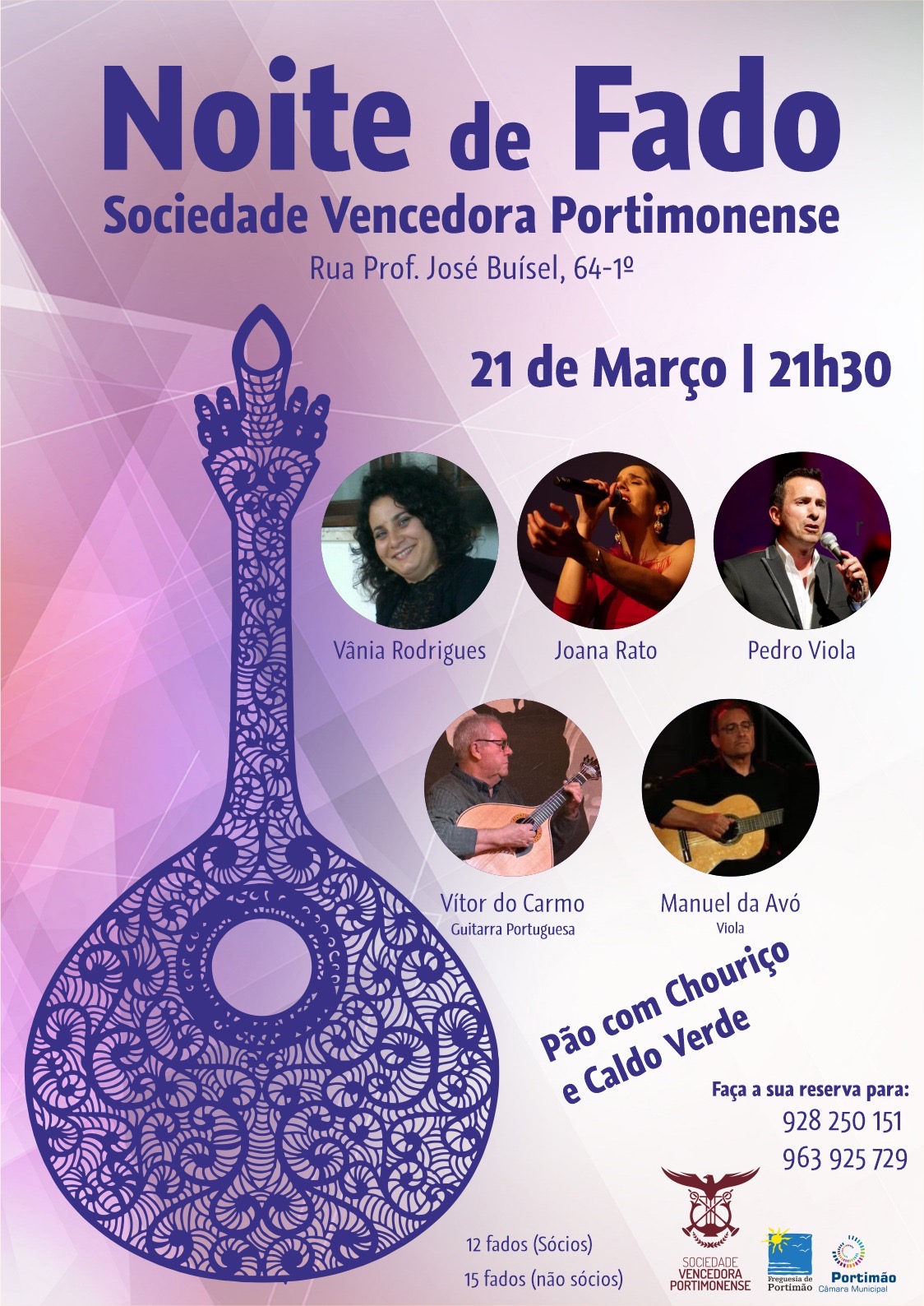 No dia 21 de março, o Fado ecoará nas paredes da Vencedora quando, pelas 21h30, subirem ao palco as fadistas Joana Rato e Vânia Rodrigues e o fadista Pedro Viola, acompanhados por Vitor do Carmo, na guitarra portuguesa, e Manuel da Avó, na viola de fado, para mais uma grande NOITE DE FADO. O valor da entrada são 15 fados para não sócios e 12 fados para sócios, o que inclui uma bebida, pão com chouriço e caldo verde e as reservas devem ser efetuadas para os telefones nrs.: 928 250 151 e 963 925 729.