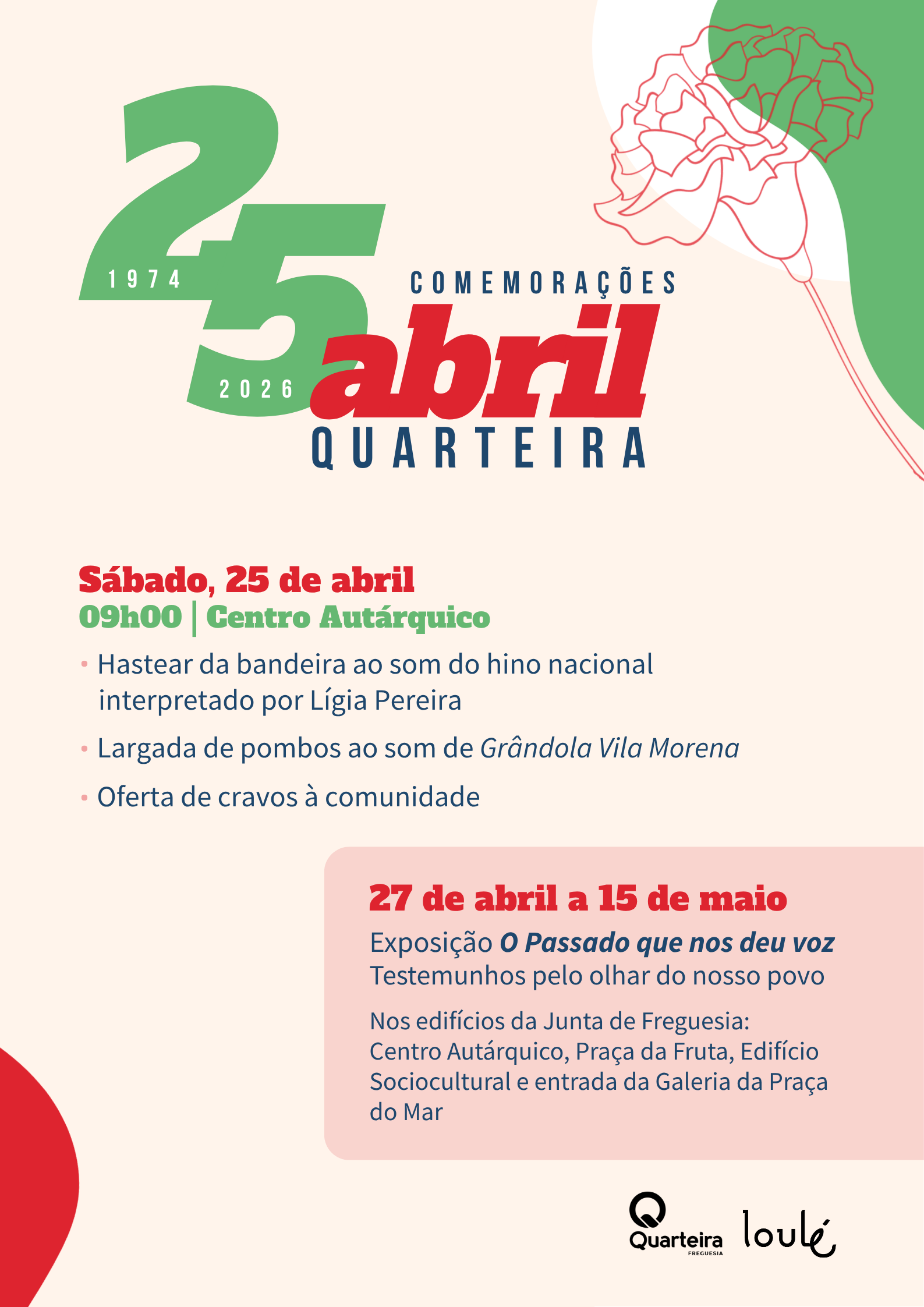 As comemorações do 25 de Abril em Quarteira são organizadas pela Junta de Freguesia, com o apoio do Município de Loulé.