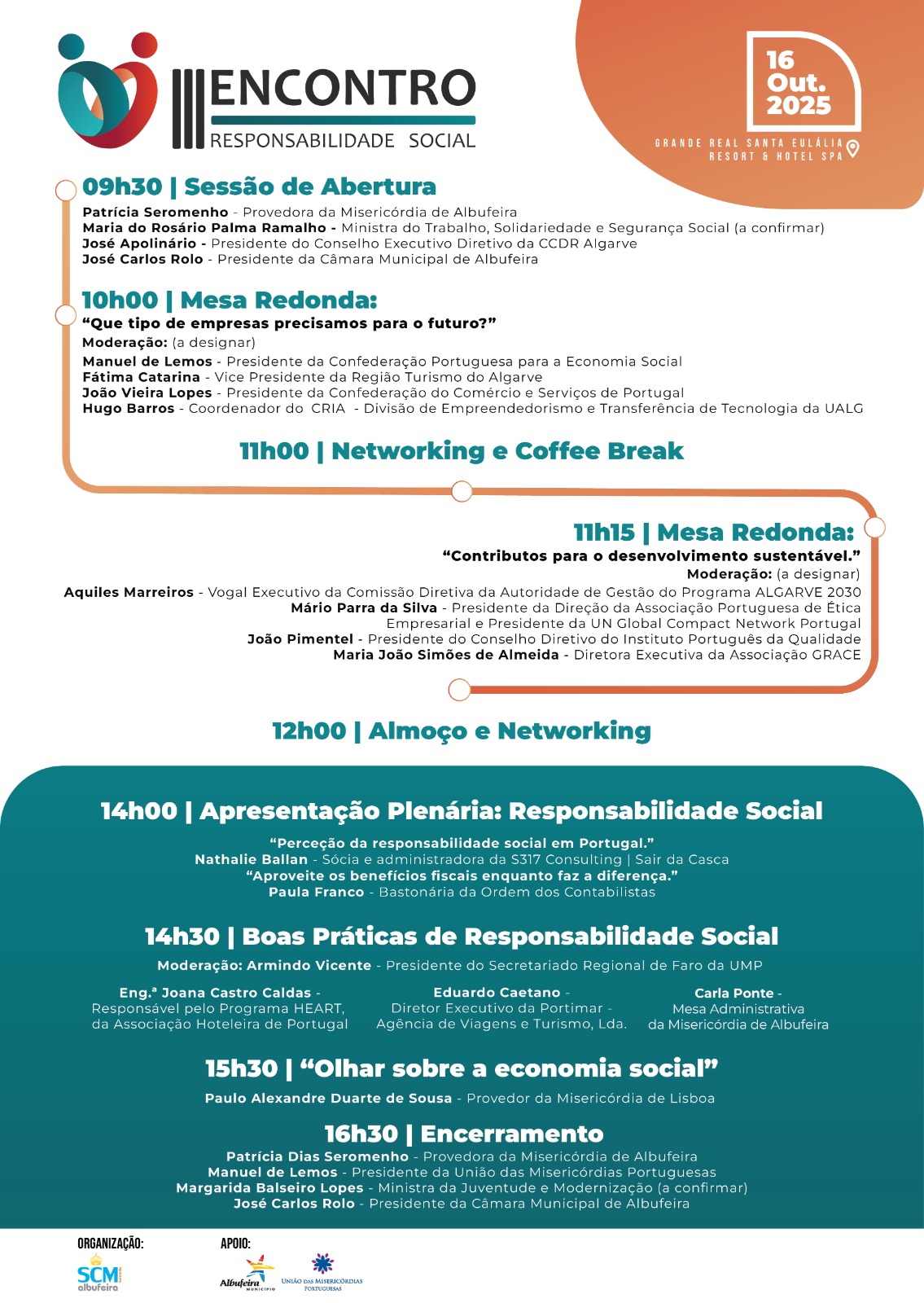 O evento decorre no Hotel Grande Real Santa Eulália, em Albufeira, e tem participação gratuita, mas sujeita a inscrição prévia em: www.misericordiaalbufeira.com/iii-encontro-de-responsabilidade-social.
