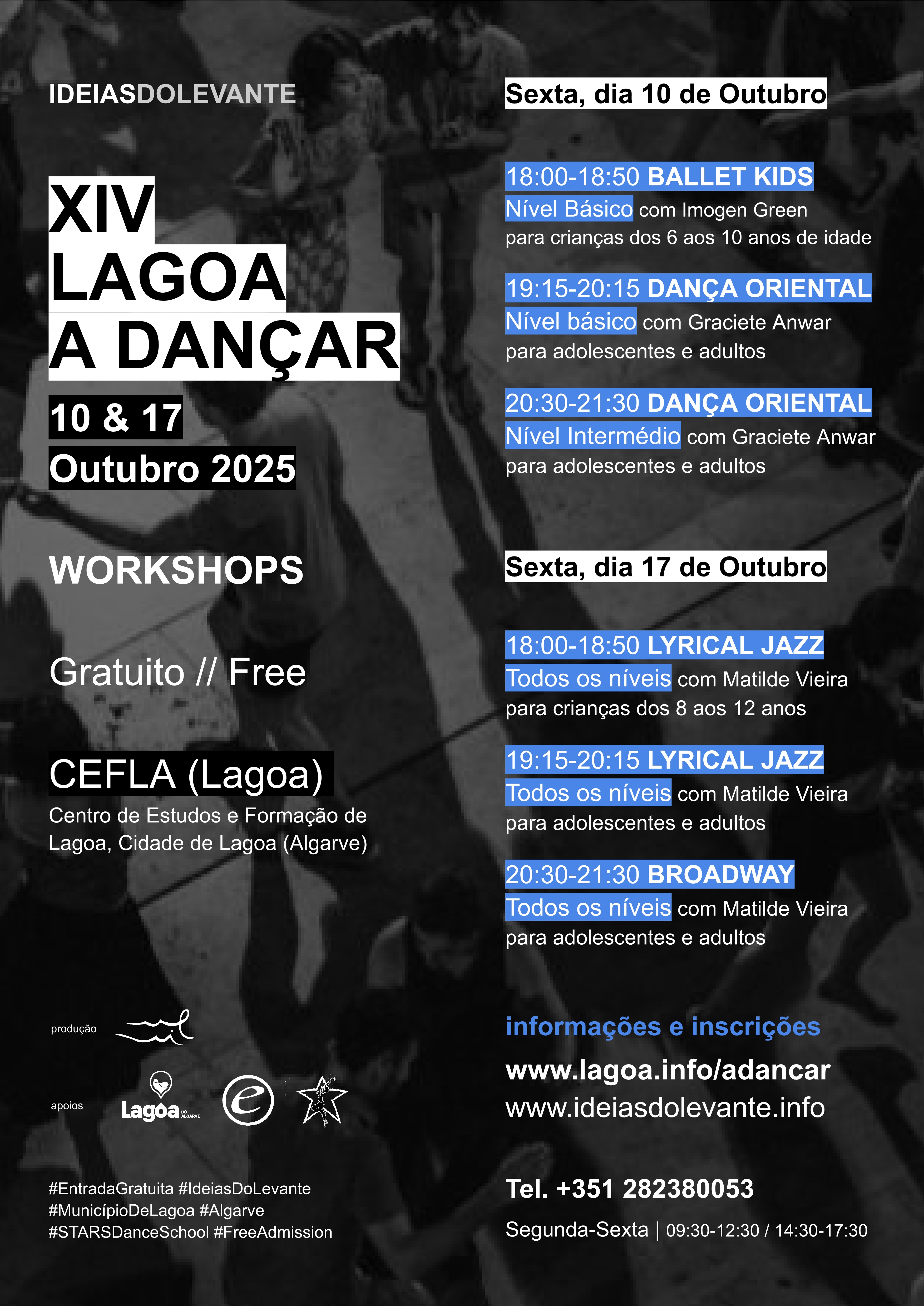A Ideias do Levante é uma associação cultural, fundada a 27 de Abril de 1995, com sede em Lagoa (Algarve, Portugal) e extensão em Portimão (Espaço Portas do Sol), com atividade em torno da formação, produção e promoção cultural, através de projetos regulares e pontuais, não só, na área das artes performativas, visuais e literárias, como também, na área da saúde e do bem-estar. Mais informações via www.ideiasdolevante.info.