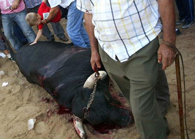 A estocada final foi dada cerca das 19:50, depois de o touro, à semelhança de anos anteriores, ter sido laçado e preso ao muro da arena improvisada, na antiga praça de armas do castelo de Monsaraz, histórica povoação localizada nas margens da albufeira de Alqueva, no concelho de Reguengos de Monsaraz.