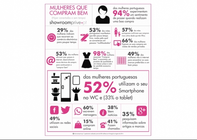 Considerando os dados revelados pelo estudo “Showroomprive Smart Shopping Satisfaction 2014”, dirigido a um total de 210 “Digital Women” em Portugal, 38% das mulheres portuguesas manifestam que têm pouco tempo livre e que se converteram em pessoas “multi tarefa”, número que aumenta sensivelmente aos 53% no caso específico das Digital Mums.