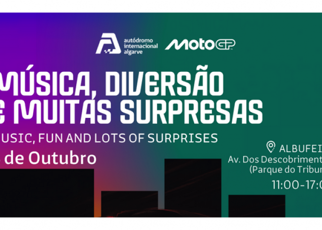 O evento, que decorre entre as 11h00 e as 17h00, no Parque de Estacionamento frente ao Tribunal e na Avenida dos Descobrimentos, promete um dia cheio de emoção com os stunt shows de Humberto Ribeiro, música, passatempos, brindes, mini motas e fotos para mais tarde recordar. O evento faz parte de uma parceria entre o Autódromo Internacional do Algarve e o Município de Albufeira. Reúna a família e os amigos e venha viver a adrenalina do MotoGP!