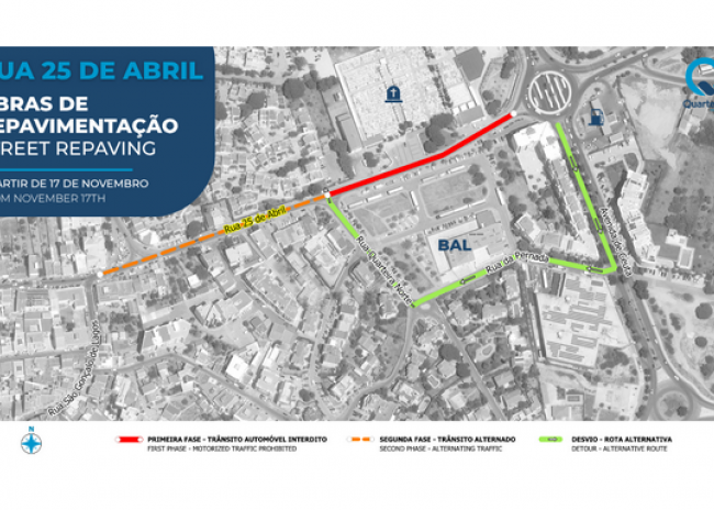 A Rua 25 de Abril em Quarteira será alvo de obras de repavimentação com início hoje, dia 17 de novembro. Os trabalhos, que visam melhorar a qualidade da circulação nesta via, têm uma previsão de duração expectável de 10 dias.