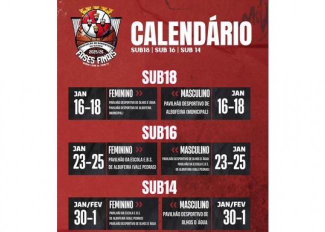 No fim-de-semana de 23, 24 e 25 de janeiro, vão decorrer as Fases Finais Regionais do escalão de SUB16, Masculinos e Femininos, no Pavilhão da Escola E.B.S. de Albufeira (Vale Pedras).