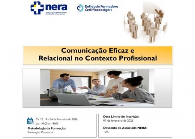 Com o objetivo de identificar e desenvolver as competências para comunicar de forma dinâmica e persuasiva na apresentação de uma ideia ou de um projeto, em reuniões, em apresentações formais, com equipas de trabalho e com o público e capacitar os profissionais a apresentar a mensagem desejada com assertividade, de forma clara, consistente e segura, facilitando o entendimento do público-alvo em geral, o NERA irá realizar, nos dias 05, 12, 19 e 26 de fevereiro de 2026, das 14h00 às 18h00, a ação de formação: Comunicação Eficaz e Relacional no Contexto Profissional.