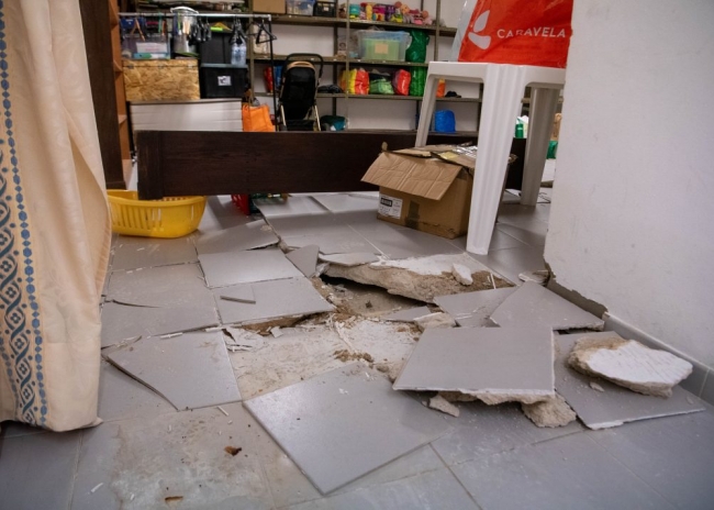 E foi quando acederam à cave do edifício para entrar nas salas que servem para guardar arrumos e os alimentos e outros bens doados para pessoas cadenciadas assistidas pelas paróquias que os responsáveis se depararam com o cenário de destruição provocado pela infiltração subterrânea das águas que provocou não só uma inundação naquelas divisões, mas um forte levantamento do chão que fez rebentar o pavimento, provocando grandes fendas. Uma das escadas de acesso àquele piso também sofreu danos com a pressão a que foi sujeita.