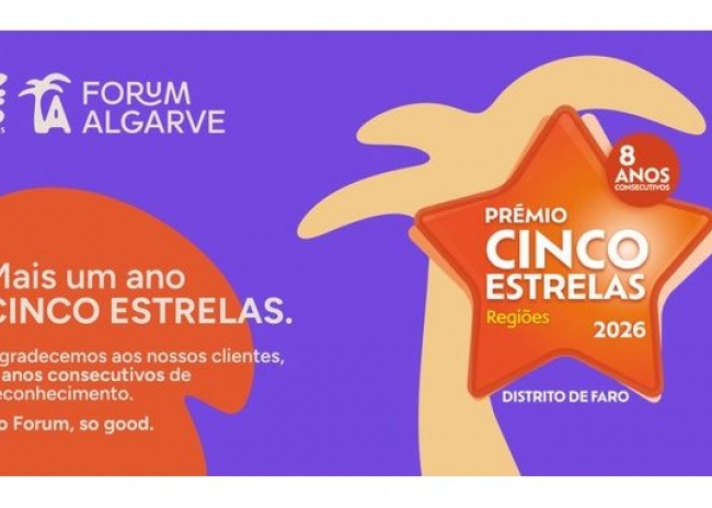 O Forum Algarve foi distinguido com o ‘Prémio Cinco Estrelas Regiões 2026’, na categoria ‘Centros Comerciais’. Este é o oitavo ano consecutivo que o centro comercial, gerido pela Multi Portugal, recebe esta distinção. O ‘Prémio Cinco Estrelas Regiões’ destaca as principais marcas e ícones regionais, premiando aqueles que se evidenciam pelo seu elevado nível de satisfação global junto dos consumidores.
