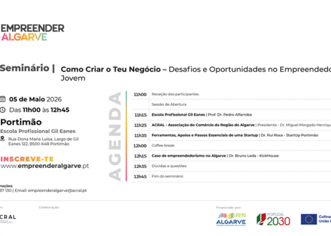 Promovido no âmbito do projeto Empreender Algarve, o seminário pretende incentivar o espírito empreendedor junto da comunidade jovem, proporcionando informação e reflexão sobre os desafios e oportunidades associados à criação de novos negócios.
