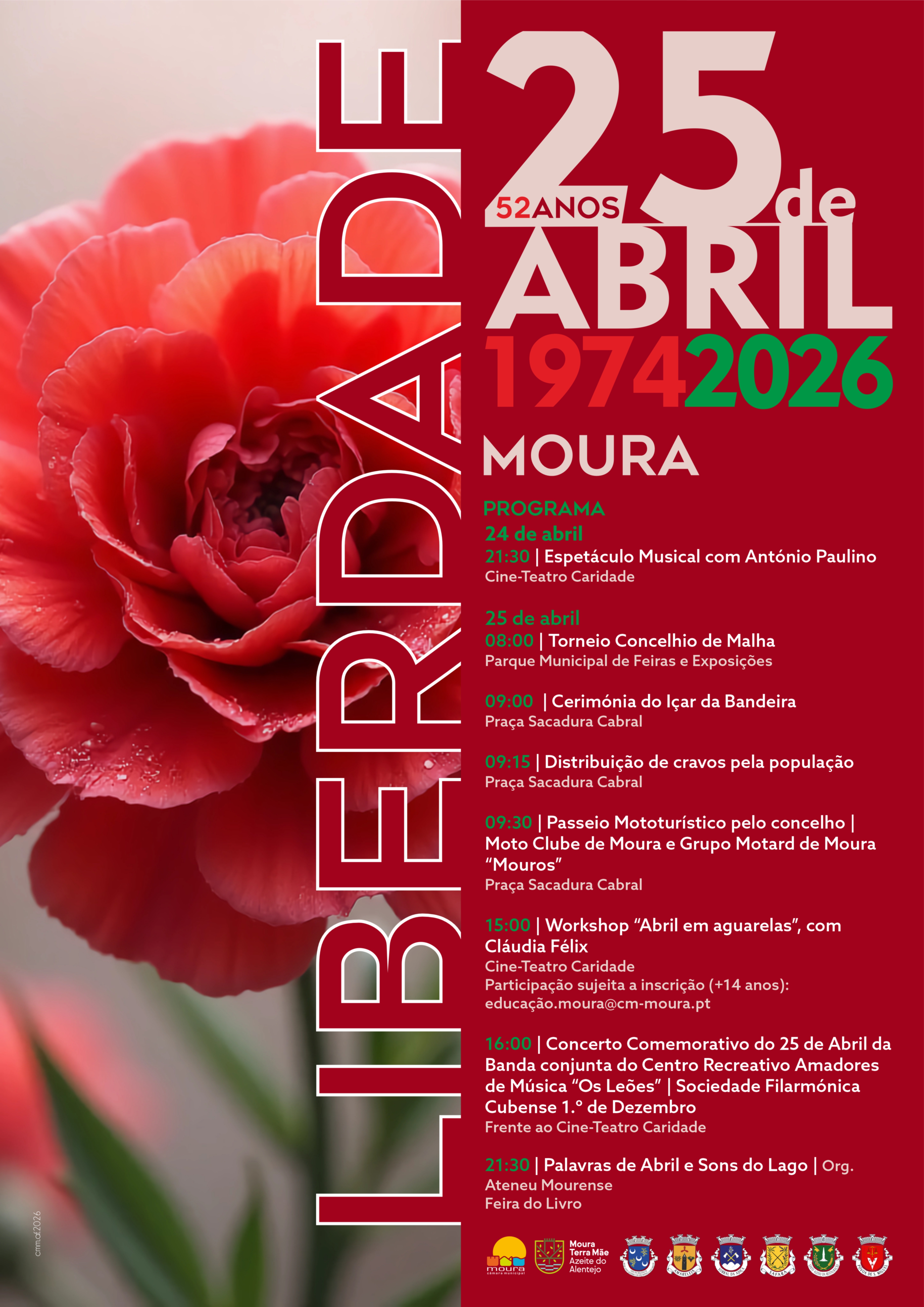 A Câmara Municipal de Moura apela à participação da população nas comemorações, convidando todos a celebrar os 52 anos do 25 de Abril, símbolo maior da liberdade em Portugal.