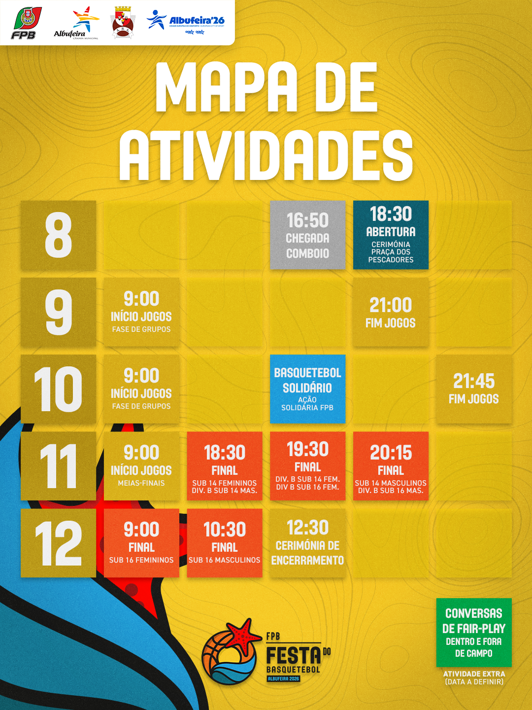 No dia 12, a partir das 9 horas, jogam-se as Finais dos escalões de Sub16 Feminino e Masculino, com a respetiva cerimónia de encerramento logo a seguir (12h).