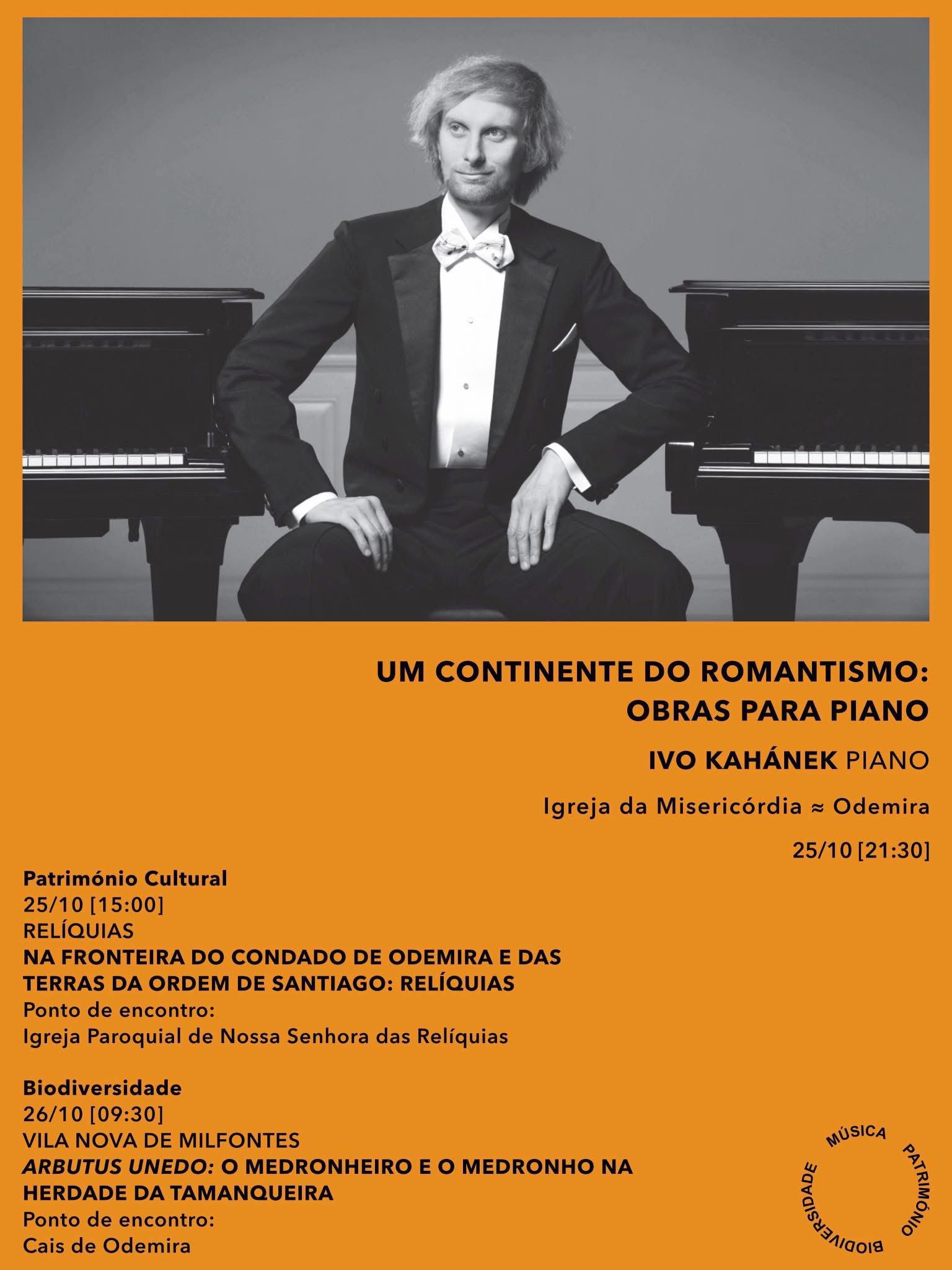 O festival traz ao concelho o célebre pianista checo Ivo Kahánek, que se apresenta no sábado, 25 de outubro, às 21h30, na Igreja da Misericórdia, com o recital “Um Continente do Romantismo: Obras para Piano”. Presença regular nas grandes salas europeias, Kahánek traz a Odemira um programa que abrange obras de Clara e Robert Schumann, Dvořák, Smetana, Kaprálová e Martinů, revelando a intensidade e a expressão do Romantismo europeu, numa combinação de emoção, tradição e modernidade.
