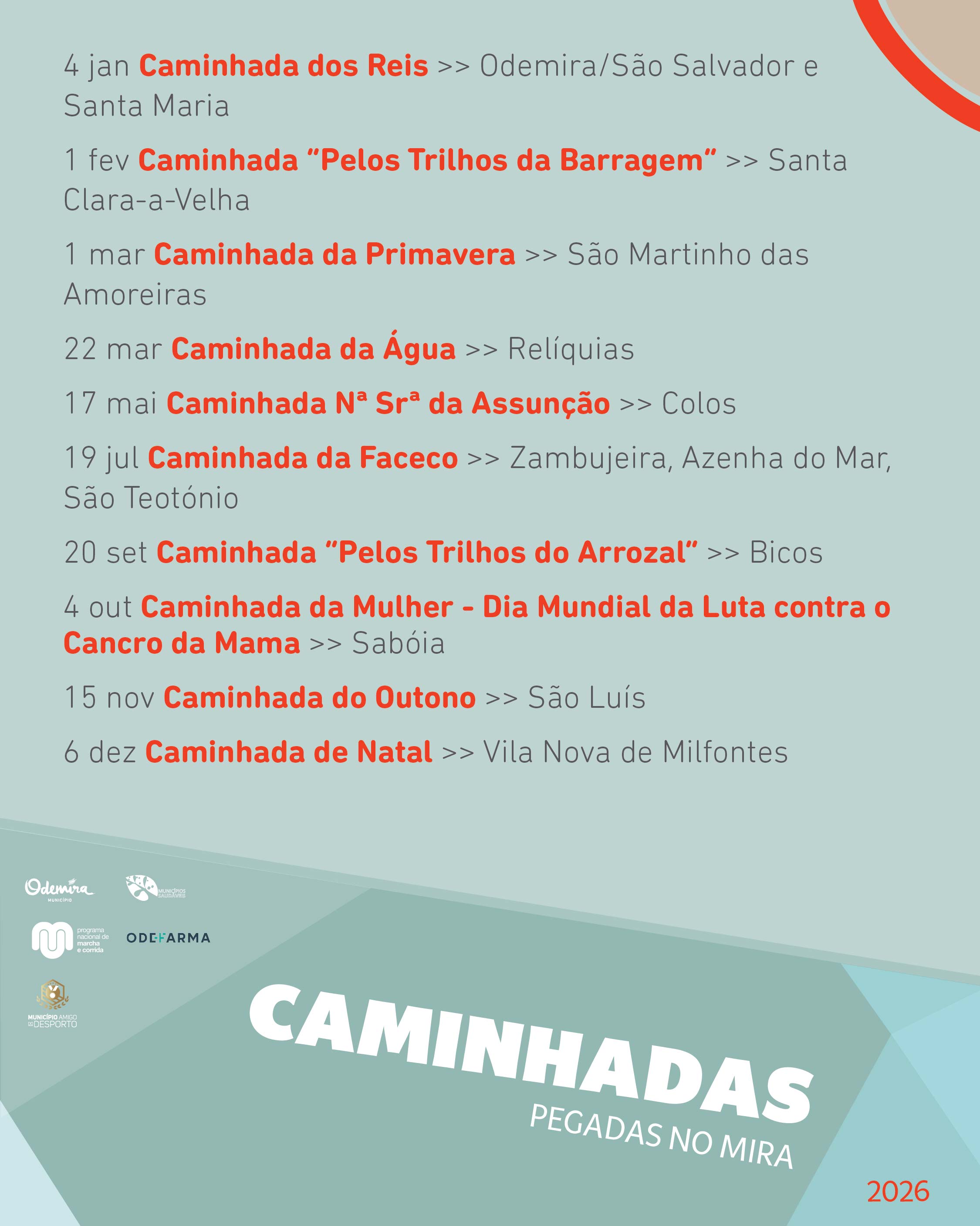 Para 2026, o Município de Odemira reforça o programa, que passa a integrar dez caminhadas, distribuídas ao longo do ano e por várias freguesias do concelho. A Caminhada dos Reis, em Odemira, marcou o arranque das “Pegadas no Mira” no dia 4 de janeiro. As próximas iniciativas passam por Santa Clara-a-Velha (1 de fevereiro), São Martinho das Amoreiras (1 de março), Relíquias (22 de março) e Colos (17 de maio). O programa continua no verão, com uma iniciativa associada à FACECO - Feira das Atividades Económicas do Concelho de Odemira, a 19 de julho, que percorrerá trilhos da Zambujeira do Mar, Azenha do Mar e São Teotónio. Segue-se Bicos (20 de setembro), Sabóia (4 de outubro, com a Caminhada da Mulher - Dia Mundial da Luta contra o Cancro da Mama), São Luís (15 de novembro) e Vila Nova de Milfontes (6 de dezembro).