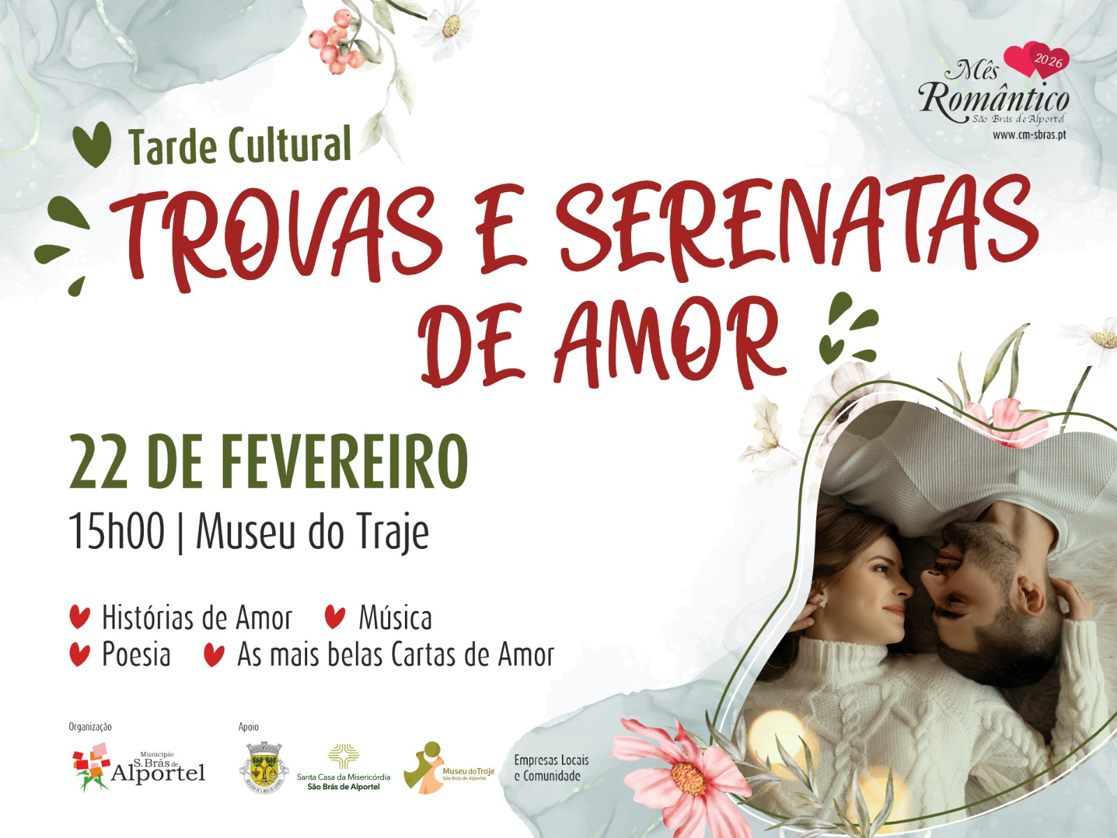 O programa culmina com mais uma edição das “Trovas e Serenatas de Amor”, no dia 22 de fevereiro. Uma tarde cultural que celebra o amor com música, poesia, as cartas vencedoras do concurso “A Mais Bela Carta de Amor” e histórias de amor de casais são-brasenses com mais de cinquenta anos de união, que passam pela Galeria Nova do Museu do Traje, a partir das 15h30. A entrada é gratuita. A iniciativa é organizada pelo Município, com o apoio da Junta de Freguesia, empresas locais e da comunidade.