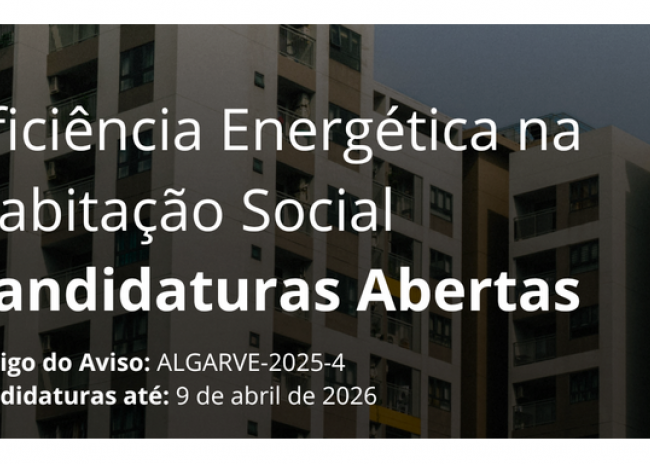 O Programa Regional Algarve 2030 tem aberto o aviso de concurso ALGARVE 2024-4 – Eficiência Energética na Habitação Social, com uma dotação de 5 milhões de euros para promoção da eficiência energética e redução das emissões de gases com efeito de estufa na Habitação Social.