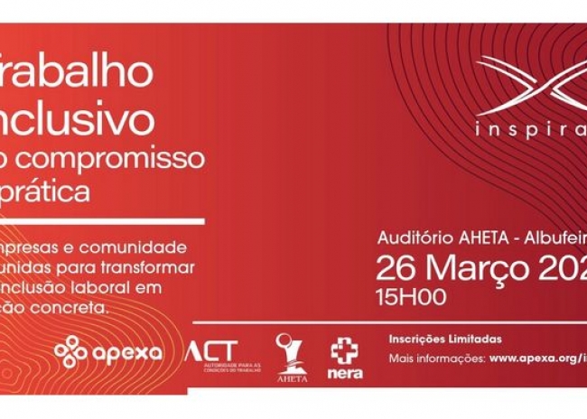 Serve o presente para informar que no próximo dia 26 de março, às 15h00, terá lugar no Auditório da AHETA, em Albufeira, a sessão dedicada ao tema «Trabalho Inclusivo: do compromisso à prática», integrada no projeto Inspira X da APEXA.