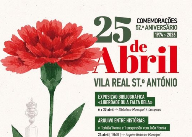 O Município de Vila Real de Santo António assinala o 52.º aniversário do 25 de Abril com um conjunto de iniciativas organizadas em colaboração com as Juntas de Freguesia do concelho. O programa inclui exposições, tertúlias, uma corrida, um espetáculo musical e a habitual Sessão Solene promovida pela Assembleia Municipal.
