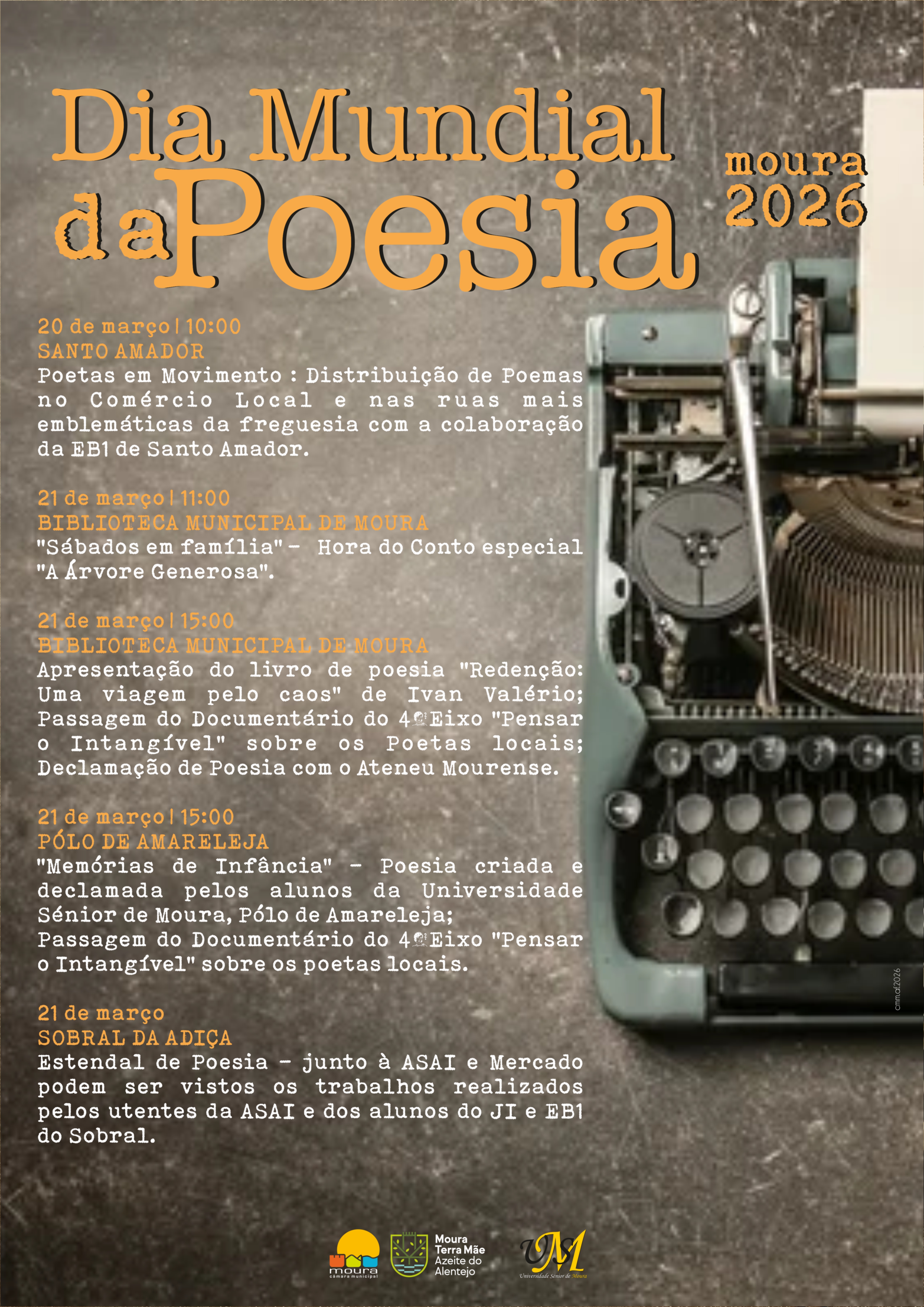 No sábado, 21 de março, Dia Mundial da Poesia, as comemorações iniciam-se às 11:00, na Biblioteca Municipal Urbano Tavares Rodrigues, com a Hora do Conto especial “A Árvore Generosa”. Às 15:00, também na Biblioteca, será apresentado o livro “Redenção: Uma viagem pelo caos”, de Ivan Valério; seguindo-se o visionamento do documentário 4.º Eixo Pensar O Intangível sobre os Poetas Locais e, de seguida, declamação de poesia com o Ateneu Mourense.