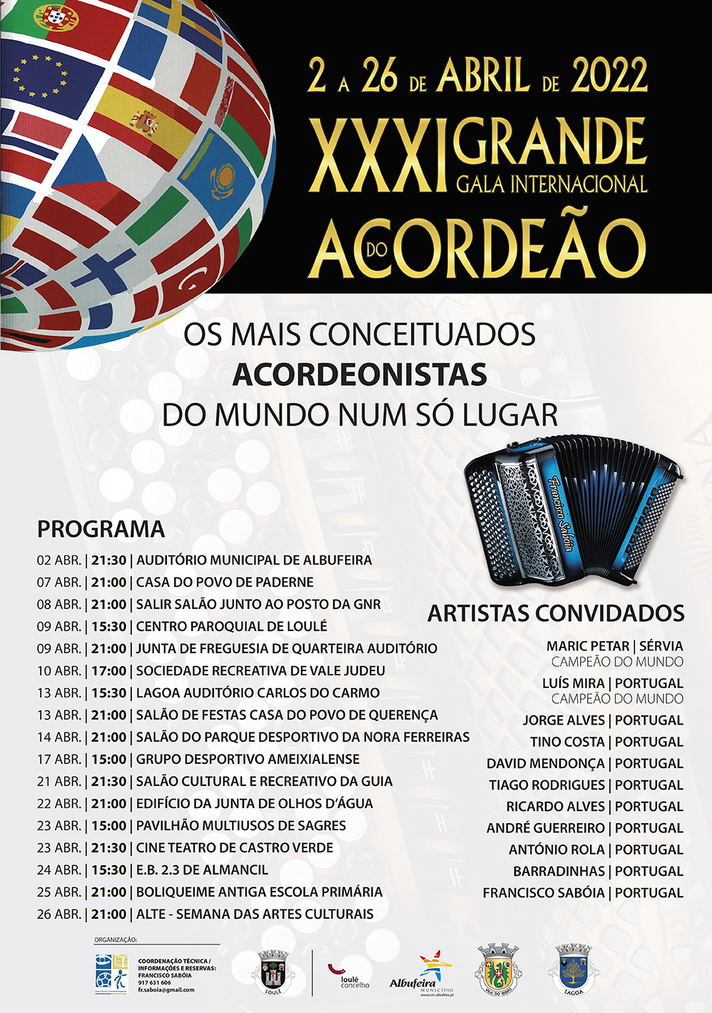 A XXXI Gala Internacional do Acordeão vai trazer de novo a Albufeira os mais reconhecidos acordeonistas do panorama nacional e internacional. O evento, organizado com o apoio do Município de Albufeira, conta com a atuação de alguns dos campeões mundiais. Convidados para edição deste ano estão Maric Peta, da Sérvia, Luís Mira, Jorge Alves, Tino Costa, David Mendonça, Tiago Rodrigues, Ricardo Alves, André Guerreiro, António Rola, Barradinhas e Francisco Sabóia. Estas são algumas das caras que vão subir ao palco já a partir do próximo sábado, dia 2 de abril, às 21h30, no Auditório Municipal de Albufeira, fazendo do acordeão, o rei da noite.