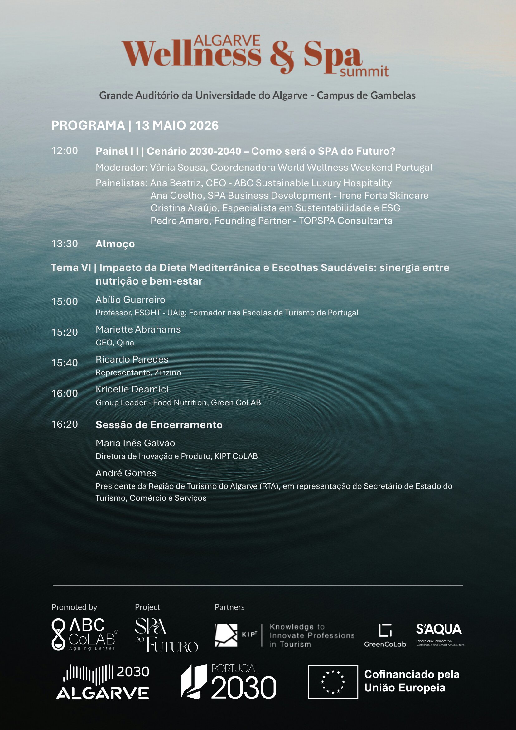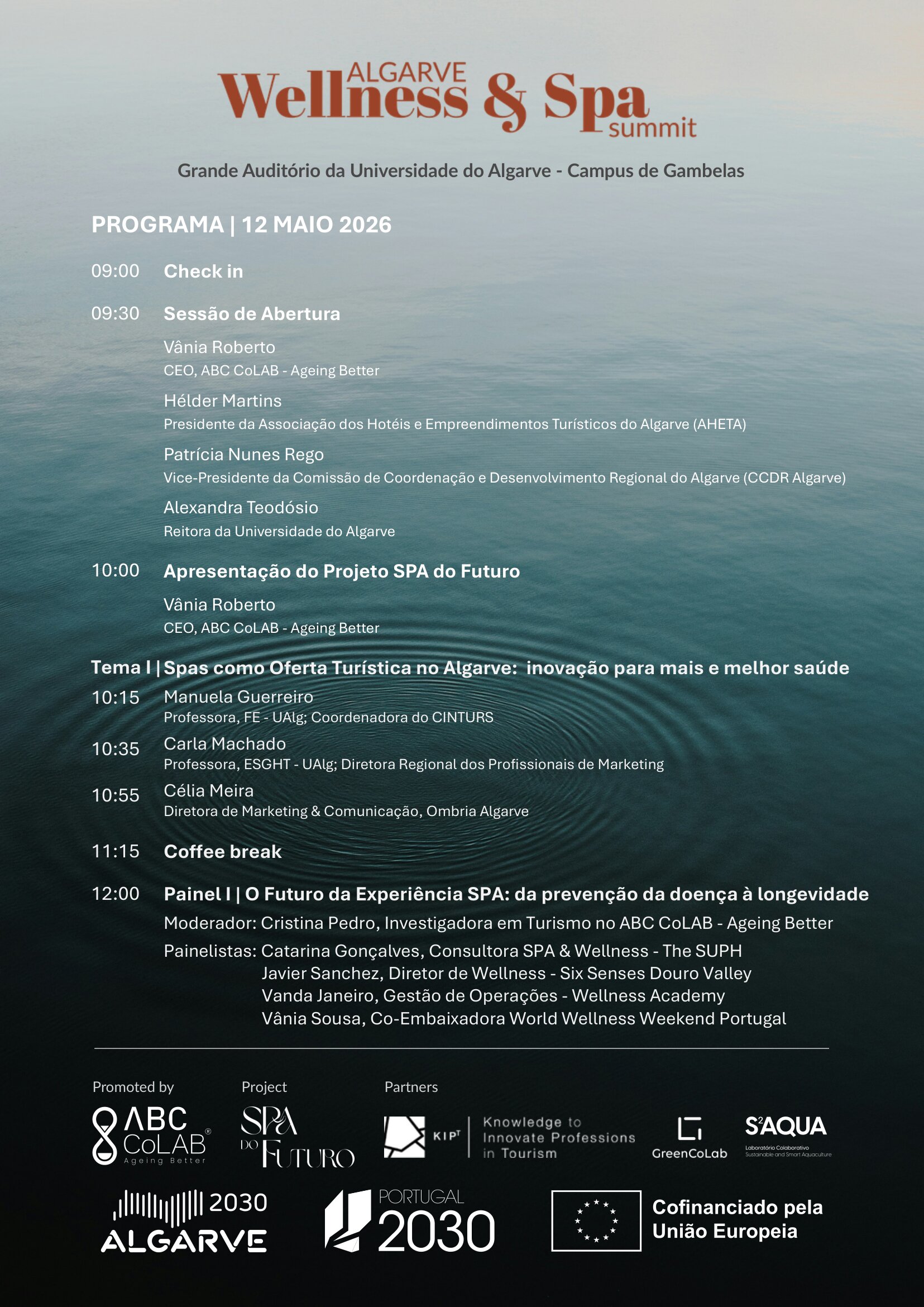 O Algarve Wellness & SPA Summit terá lugar nos dias 12 e 13 de maio, no Campus de Gambelas (Faro), e é promovido pelo ABC CoLAB – Ageing Better, no âmbito do projeto SPA do Futuro, cofinanciado pelo Programa Algarve 2030.