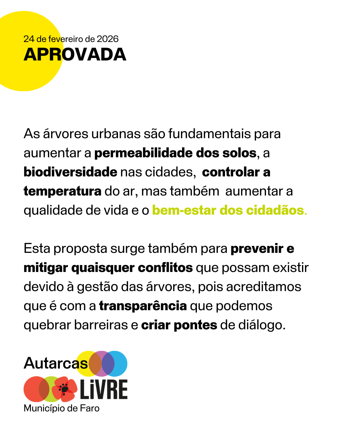 O documento solicita a aplicação da Lei n.º 59/2021 de 18 de agosto, o Regime Jurídico de Gestão do Arvoredo Urbano, que estabelece que “no âmbito das suas atribuições, compete aos municípios [até agosto de 2022] elaborar e aprovar um regulamento municipal de gestão do arvoredo em meio urbano, no prazo de um ano a contar da data da publicação da presente lei”, que regule as podas, abates e transplantes em espaços públicos e que o faça de forma transparente. É defendido ainda que a criação deste Regulamento deve envolver os serviços municipais, as juntas de freguesia e a sociedade civil.