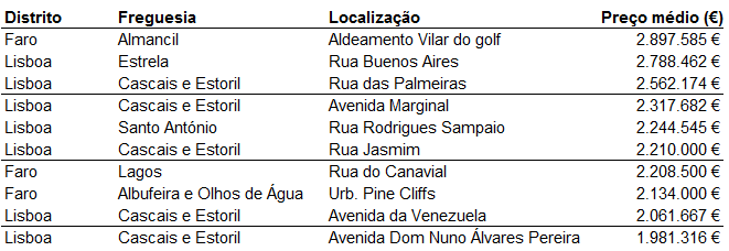 Em Lagos no Algarve encontra-se a sétima rua mais cara, a Rua do Canavial, que conta com casas a um preço médio de 2.208.500 euros. A lista das dez ruas mais caras completa-se com a Urbanização Pine Cliffs, em Albufeira (2.134.000 euros), a Avenida da Venezuela (2.061.667 euros) e a Avenida Dom Nuno Álvares Pereira (1.981.316 euros), ambas em Cascais.