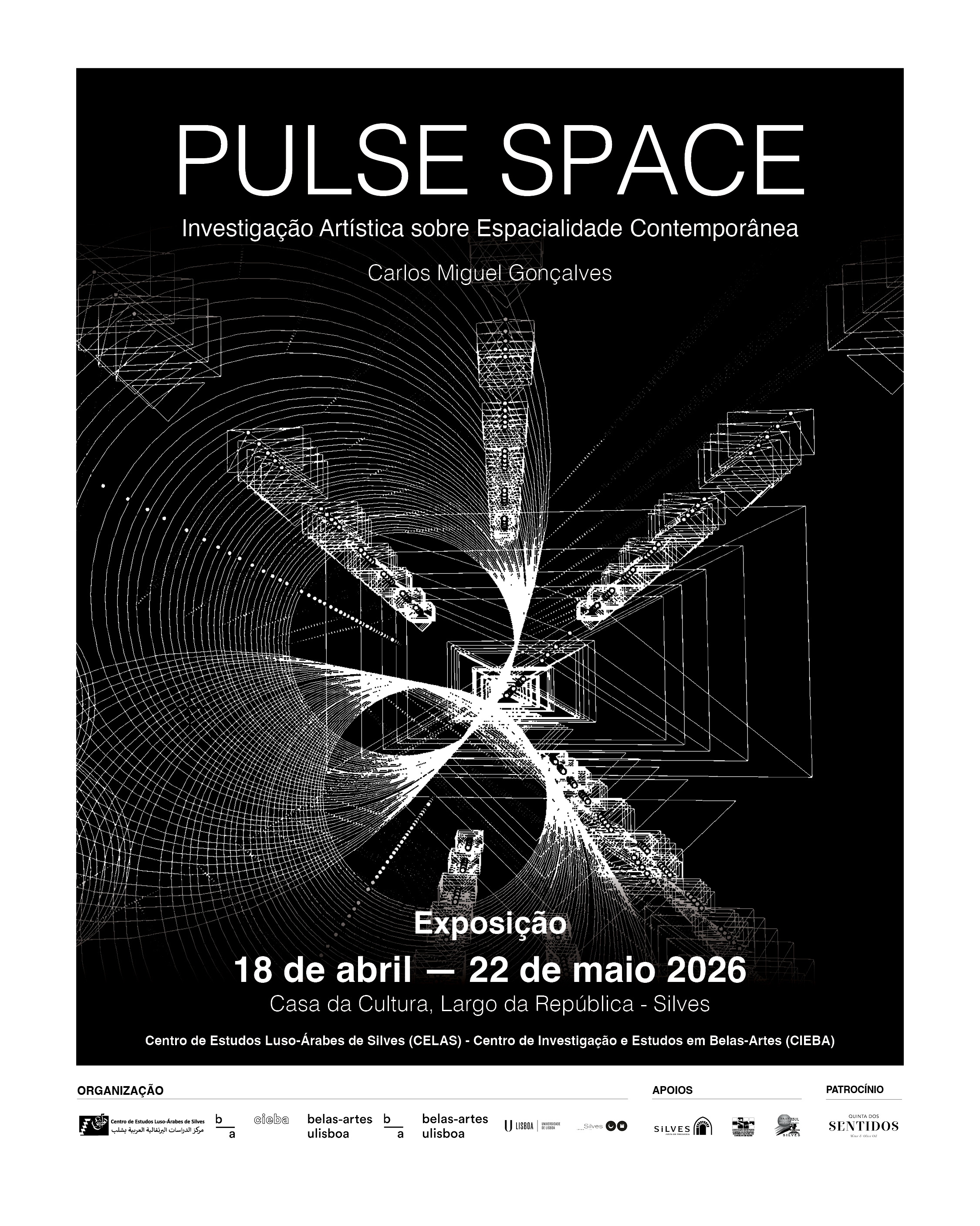 PULSE SPACE, da autoria de Carlos Miguel Gonçalves, inaugura no próximo dia 18 de abril às 15h45m, de 2026, na Casa da Cultura, em Silves, onde ficará patente ao público até 22 de maio. Integrada no âmbito da sua investigação artística de doutoramento em Belas-Artes, a exposição propõe uma reflexão sobre o espaço enquanto construção cultural e simbólica, cruzando geometria, espacialidade contemporânea e práticas artísticas transmédia.