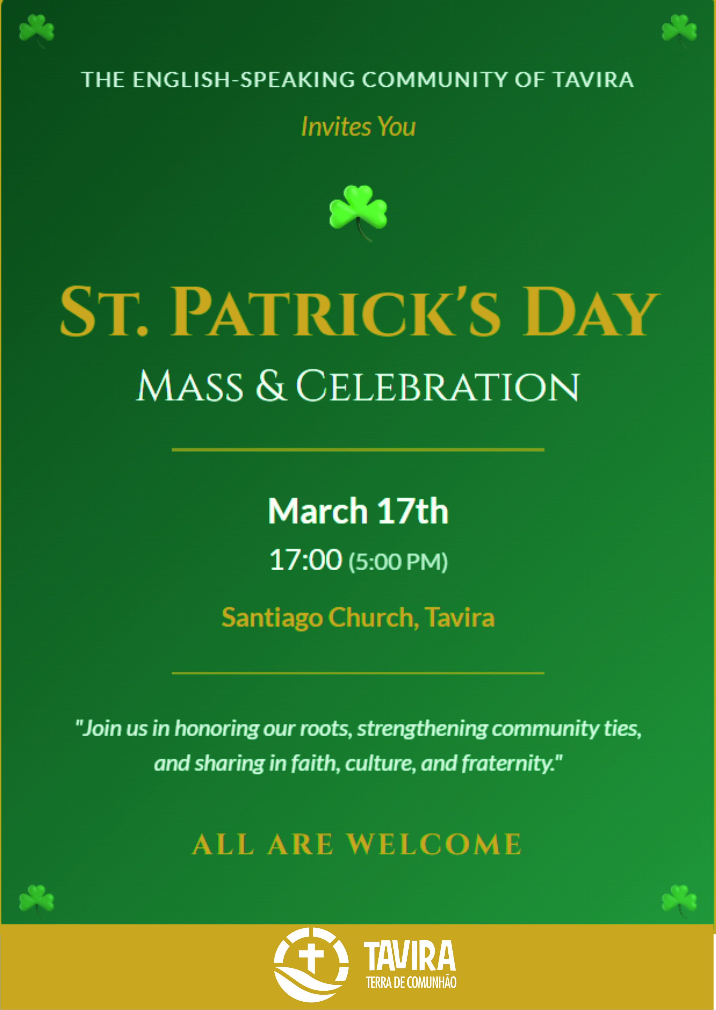 É precisamente este espírito de pertença, resiliência e celebração partilhada que a Comunidade de Língua Inglesa de Tavira pretende evocar no próximo dia 17 de março. A Igreja de Santiago abrirá as suas portas para acolher todos os que desejem assinalar a data, num ambiente de fé, cultura e fraternidade.