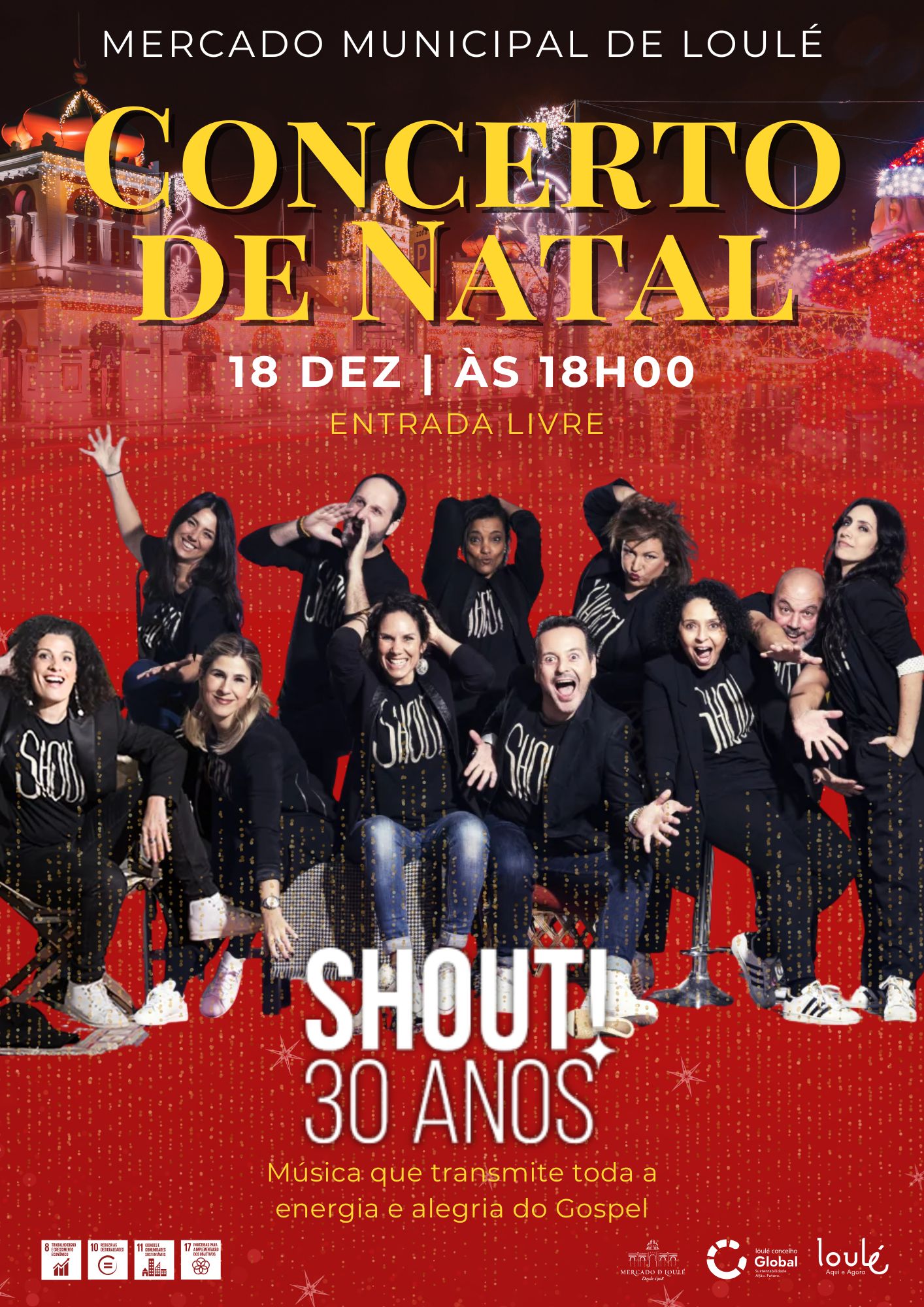 Nesta edição, o palco pertence ao grupo SHOUT!, pioneiros do Gospel em Portugal, que comemoram 30 anos de carreira e são reconhecidos pela excelência artística e energia contagiante dos seus espetáculos. O seu repertório alia arranjos originais, canções de esperança e celebração que marcam a quadra natalícia e proporcionam uma experiência inesquecível para diferentes gerações. O concerto integra-se numa agenda de animação que valoriza a tradição de encontros no Mercado, potenciando a coesão social, o acesso à cultura e estímulo ao comércio local.