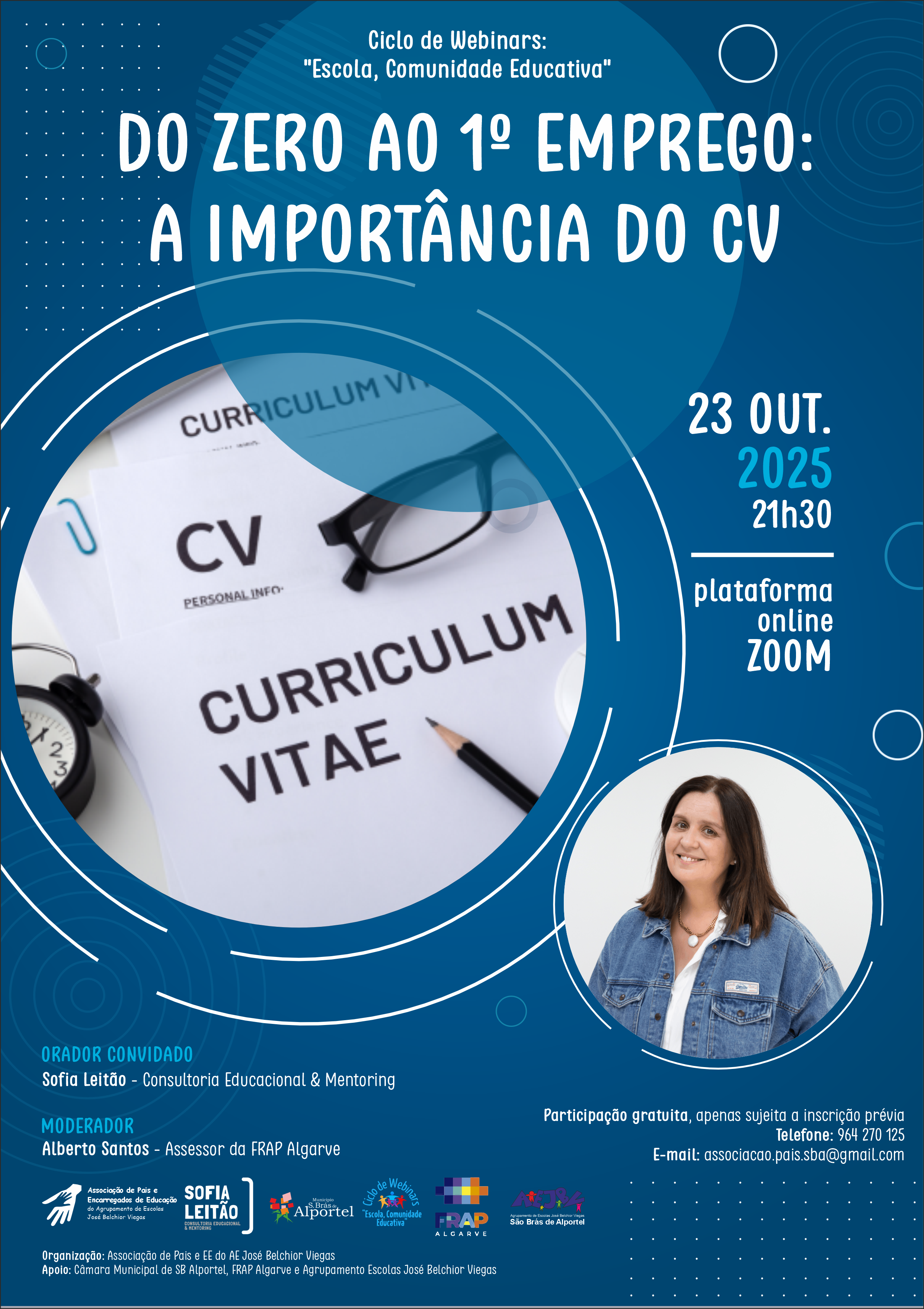 A Associação de Pais e Enc. Educação do Agrupamento de Escolas José Belchior Viegas (APEEAEJBV) de São Brás de Alportel promove, no próximo dia 23 de outubro de 2025, às 21h30, o webinar gratuito “Do Zero ao 1º Emprego: A importância do CV”, integrado no Ciclo de Webinars “Escola, Comunidade Educativa”.
