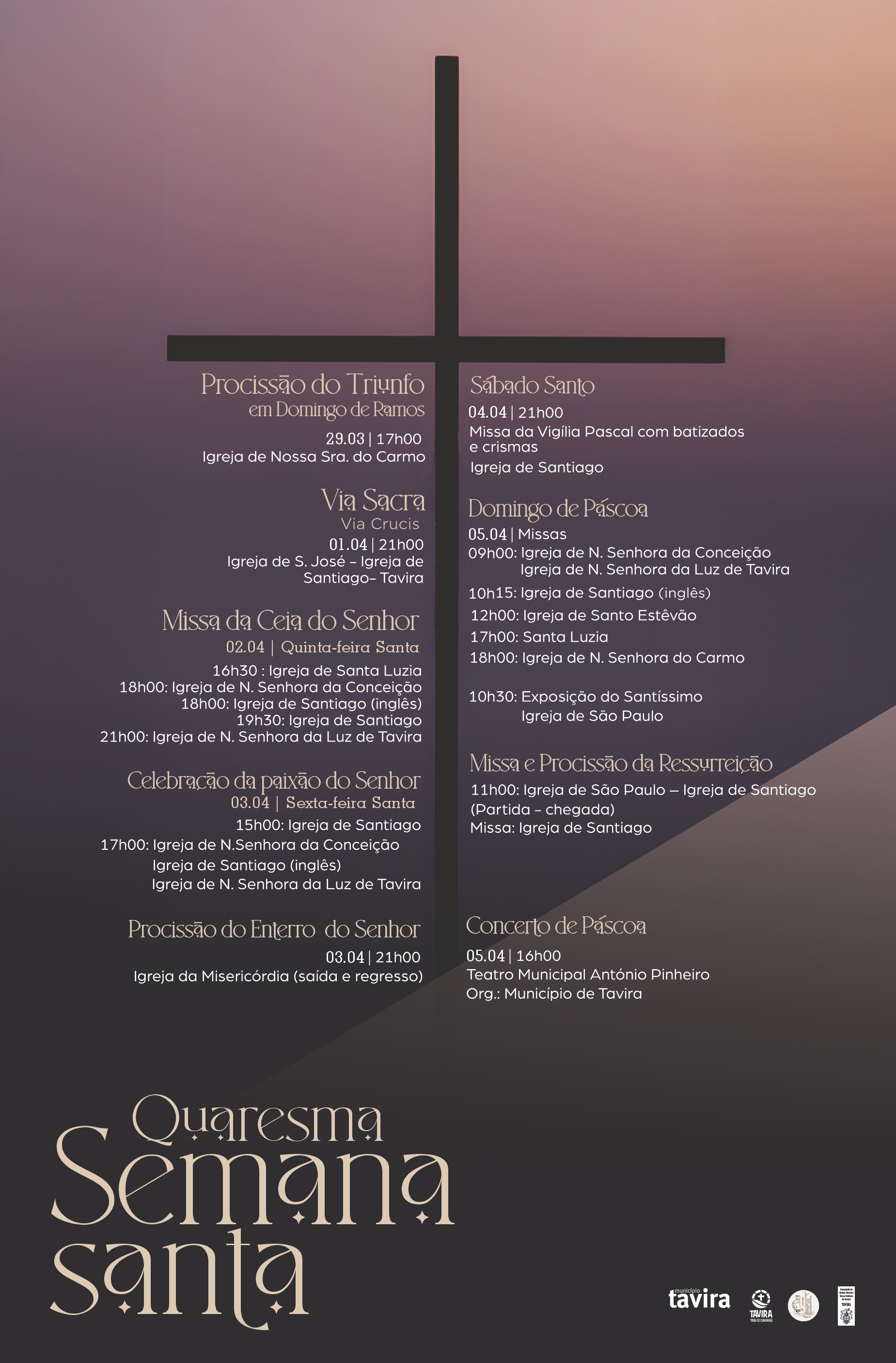 No dia 03, é possível assistir à Celebração da Paixão, na Igreja de Santiago, pelas 15h00, bem como, pelas 17h00, nas Igrejas de Nossa Senhora da Conceição (freguesia de Conceição) e Nossa Senhora da Luz (freguesia da Luz). A Procissão do Enterro do Senhor, organizada pela Santa Casa da Misericórdia de Tavira, tem lugar, no mesmo dia, Sexta-feira Santa, pelas 21h00, a partir da Igreja da Misericórdia.