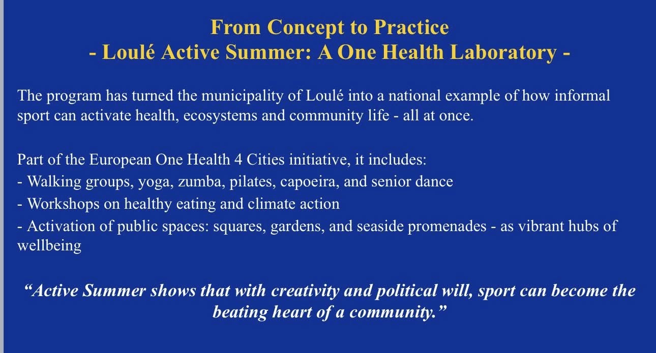 Durante a conferência, Loulé realizou uma apresentação onde foi sublinhada a importância da atividade física informal como motor de desenvolvimento económico local e como promotora de saúde pública, ambiental e animal - numa perspetiva alinhada com a visão “One Health”. O projeto “Verão Ativo” é um exemplo notável de como é possível “ativar” simultaneamente a saúde humana, a saúde ambiental e a própria comunidade, como destacou a equipa do Município de Loulé.