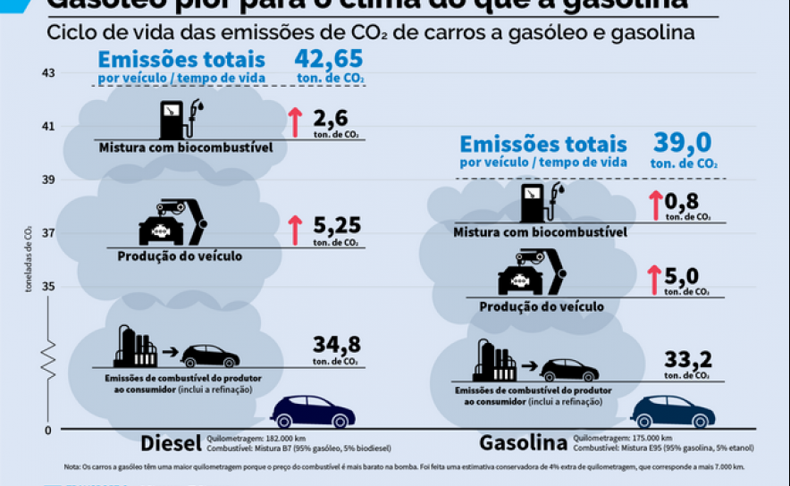 A análise do ciclo de vida das emissões de um veículo prova que os carros a gasóleo emitem mais 3,65 toneladas de CO2, do que um equivalente a gasolina. Este impacte climático superior deve-se a vários fatores, nomeadamente o facto do processo de refinação do gasóleo consumir mais energia; os veículos implicarem mais materiais para a produção de motores mais pesados e complexos; de emitirem mais pela mistura dos biocombustível com o gasóleo; e percorrerem maiores distâncias graças ao preço mais reduzido do gasóleo - ver infografia abaixo.