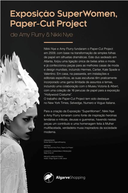 Agora no sul do país, no AlgarveShopping, as artistas americanas Nikki Nye e Amy Flurry trazem uma Exposição que integra peças artísticas, feitas manualmente em papel, que refletem o poder e a versatilidade feminina. A Exposição “SuperWomen” marca, assim, a presença desta dupla de artistas em Portugal que são, atualmente, uma referência a nível mundial na área da Moda e da Arte pelos inúmeros trabalhos artísticos que já realizam e dos quais fazem parte os grandes nomes da Alta Costura Hermès, Cartier, Kate Spade e Valentino.