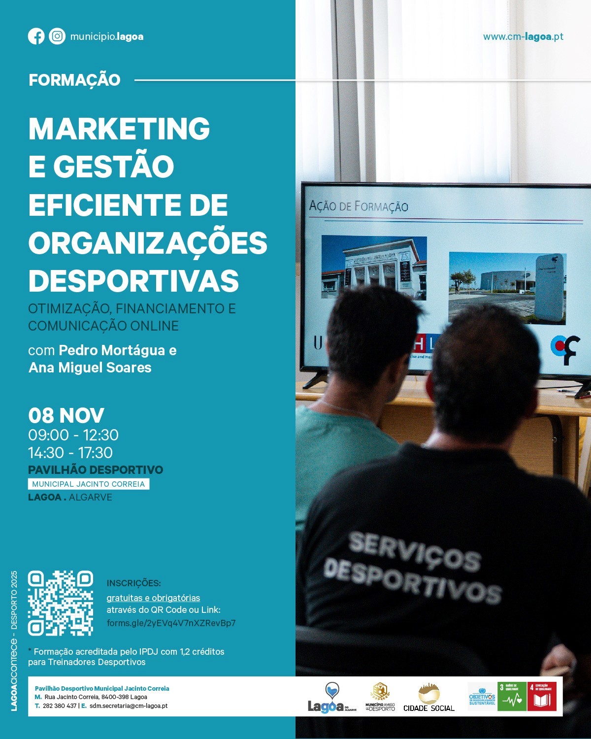 O Município de Lagoa atento à necessidade das organizações desportivas promove a Formação Marketing e Gestão Eficiente de Organizações Desportivas: Otimização, Financiamento e Comunicação Online como forma de dotar dirigentes, técnicos e gestores de clubes, associações e entidades desportivas de ferramentas práticas e inovadoras para melhorar a sua atuação dentro dos seus clubes ou associações desportivas, que irá ocorrer a 08 de novembro, no Pavilhão Desportivo Municipal Jacinto Correia, em Lagoa.