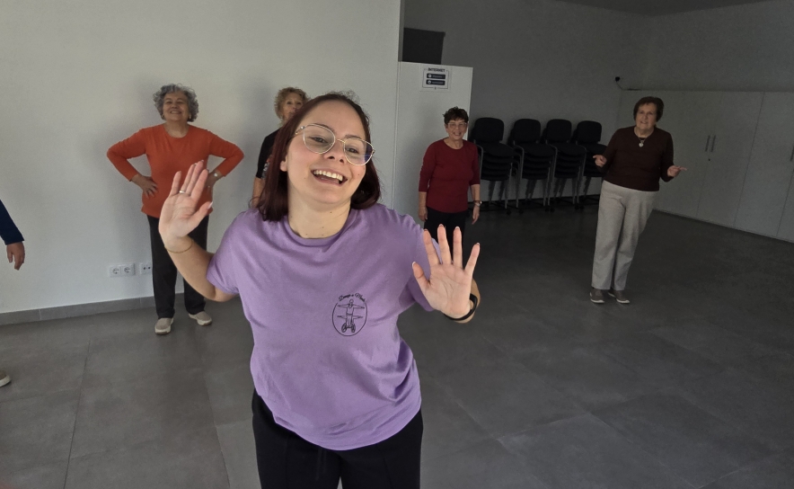 Na tarde de ontem, 19 de fevereiro, o Edifício Sociocultural de Quarteira foi palco de uma sessão especial de dança inserida no projeto "Mãos que Cuidam. Corações que Crescem" , da responsabilidade das estagiárias da Universidade do Algarve, no âmbito do programa Quarteira Longevidade com Qualidade da Junta de Freguesia de Quarteira. A atividade "Corpos em Movimento. Almas Felizes" foi dinamizada por Iara Lourenço, professora de Dança Contemporânea com um percurso marcado pela sensibilidade, competência técnica e uma alegria contagiante que rapidamente conquistou todas as participantes. Iara Lourenço não é apenas uma professora de Dança. É alguém que entende o movimento como expressão de vida, de emoção e de bem-estar. Com uma abordagem que alia o rigor técnico à suavidade, Iara conduziu a sessão com uma tranquilidade que colocou todas as participantes à vontade, independentemente das suas capacidades ou experiência prévia.