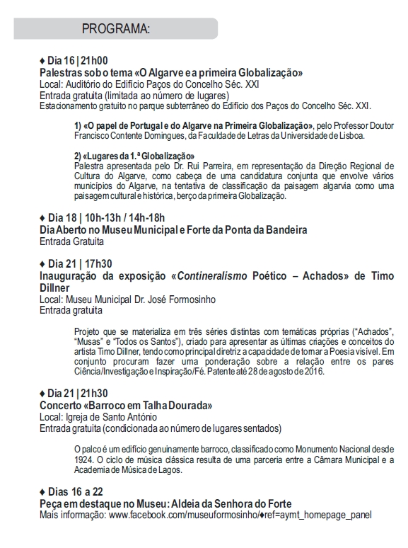 No dia 18 a entrada será gratuita no Museu Municipal e Forte da Ponta da Bandeira. Para o dia 21 estão previstas duas iniciativas: às 17h30, a inauguração da exposição «Contineralismo Poético – Achados» de Timo Dillner, no Museu Municipal Dr. José Formosinho, e mais tarde, às 21h30, um Concerto «Barroco em Talha Dourada», pela Academia de Música de Lagos, a ter lugar na Igreja de Santo António.