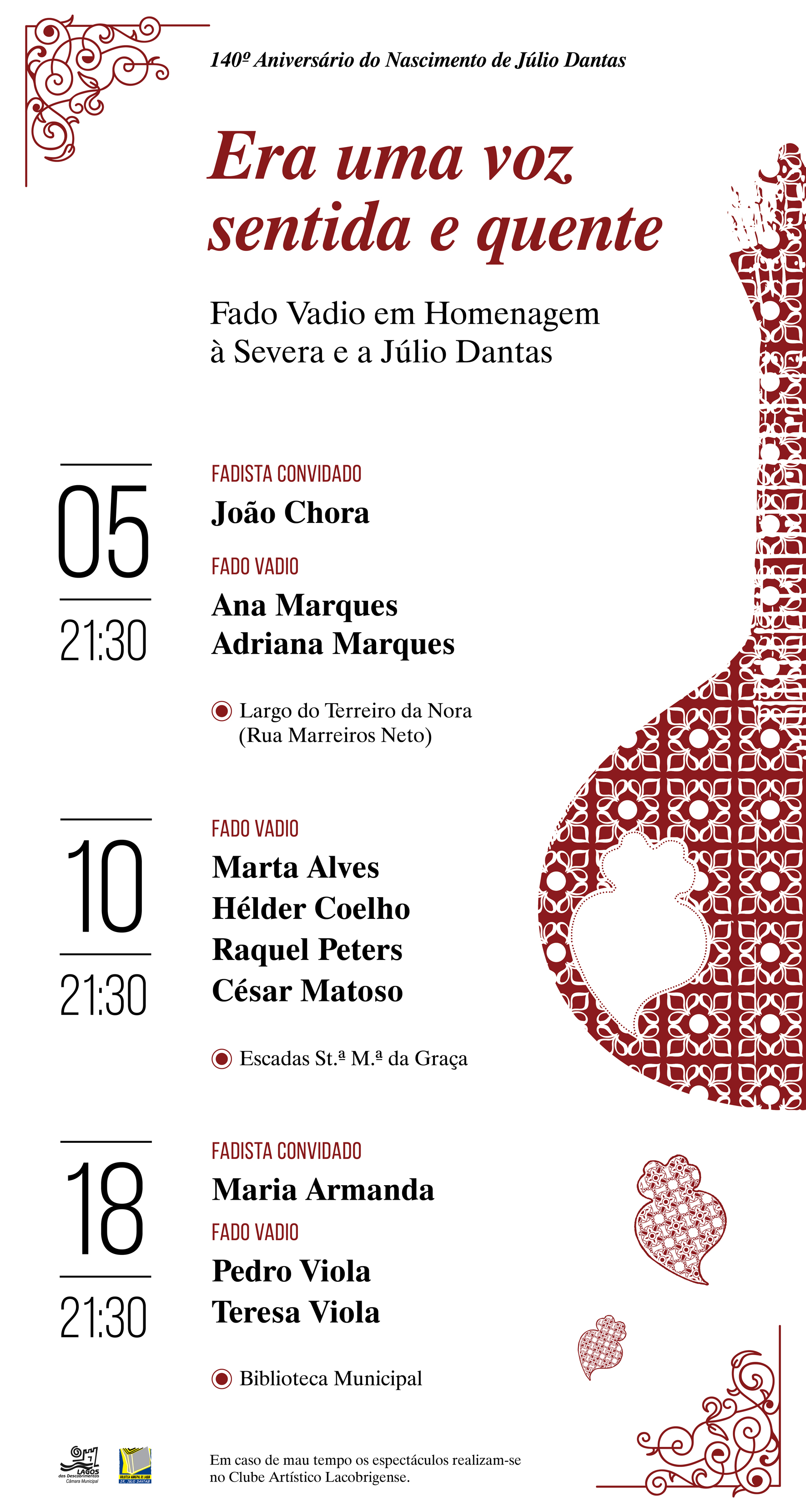 O evento “Era uma voz sentida e quente – Fado Vadio em Homenagem à Severa e a Júlio Dantas” marca, em Março, o arranque das Comemorações dos 140 Anos do Nascimento de Júlio Dantas, a par do lançamento do livro “Dantas e a Severa”, da especialista em sociologia e em estudo de género, Elsa Vieira, a ter lugar no dia 08 de março – Dia Internacional da Mulher (na Biblioteca Municipal, a partir das 21h00), e da realização de um Ciclo de Cinema dedicado ao universo feminino e às várias idealizações da Mulher, denominado “Femina: a Severa e as Outras” (Cinema às Quartas na Biblioteca Municipal, 21h00).