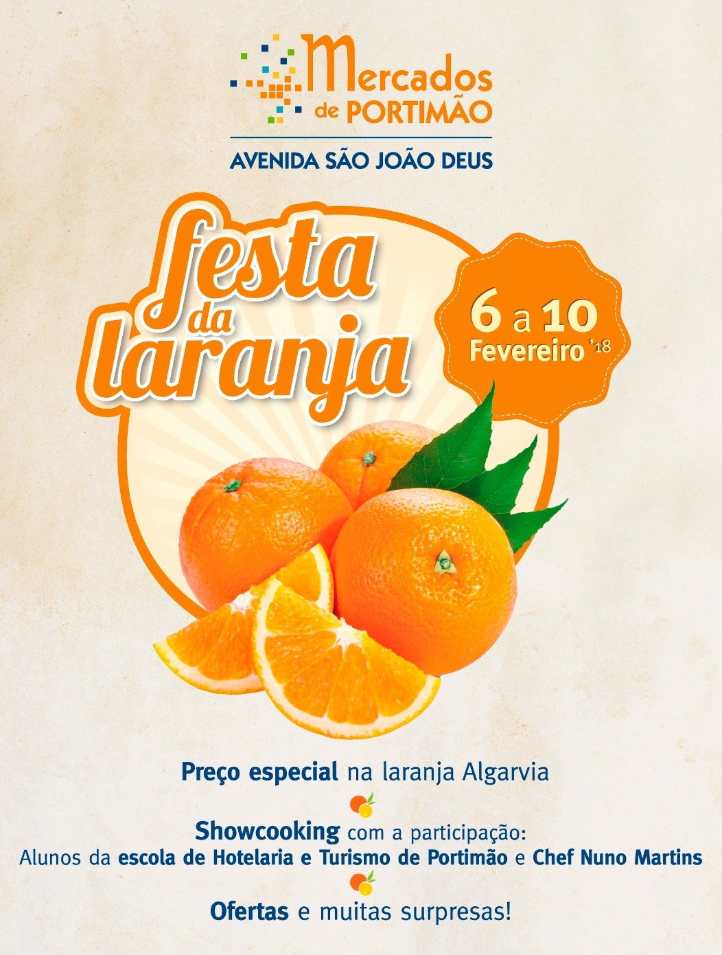 No dia 10 de fevereiro, o mercado recebe a visita especial do Chef Nuno Martins, um dos mais conceituados Chefes de Cozinha na região, que virá ao Mercado partilhar os seus segredos confecionando iguarias com os “frescos” e a deliciosa Laranja Algarvia.