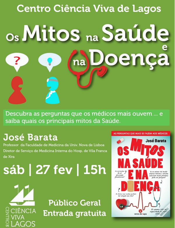 O Centro Ciência Viva de Lagos convidou o médico José Barata para, numa conversa informal e aberta a todos os interessados, desmistificar alguns dos mitos associados à Saúde e à Doença. Este médico e professor de Medicina, publicou recentemente o livro “Os Mitos na Saúde e na Doença” onde compila e responde algumas das perguntas mais frequentes que os médicos costumam ouvir, da mais simples e óbvia até à mais arcaica e complexa. O CCVL associa‐se assim mais uma vez à promoção da Literacia para a Saúde com esta Ciência à Conversa, onde um ambiente informal e acompanhados por chá e bolinhos, todos os interessados poderão colocar as suas questões.