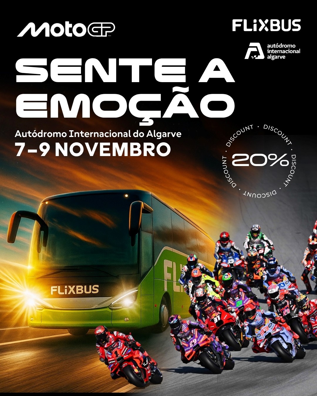 No âmbito desta parceria, os fãs do MotoGP podem usufruir de um desconto exclusivo de 20% nas viagens domésticas na rede FlixBus com destino ao Algarve, realizadas entre 3 e 11 de novembro. Para beneficiar da oferta, basta descarregar o código promocional no site da campanha, disponível aqui.